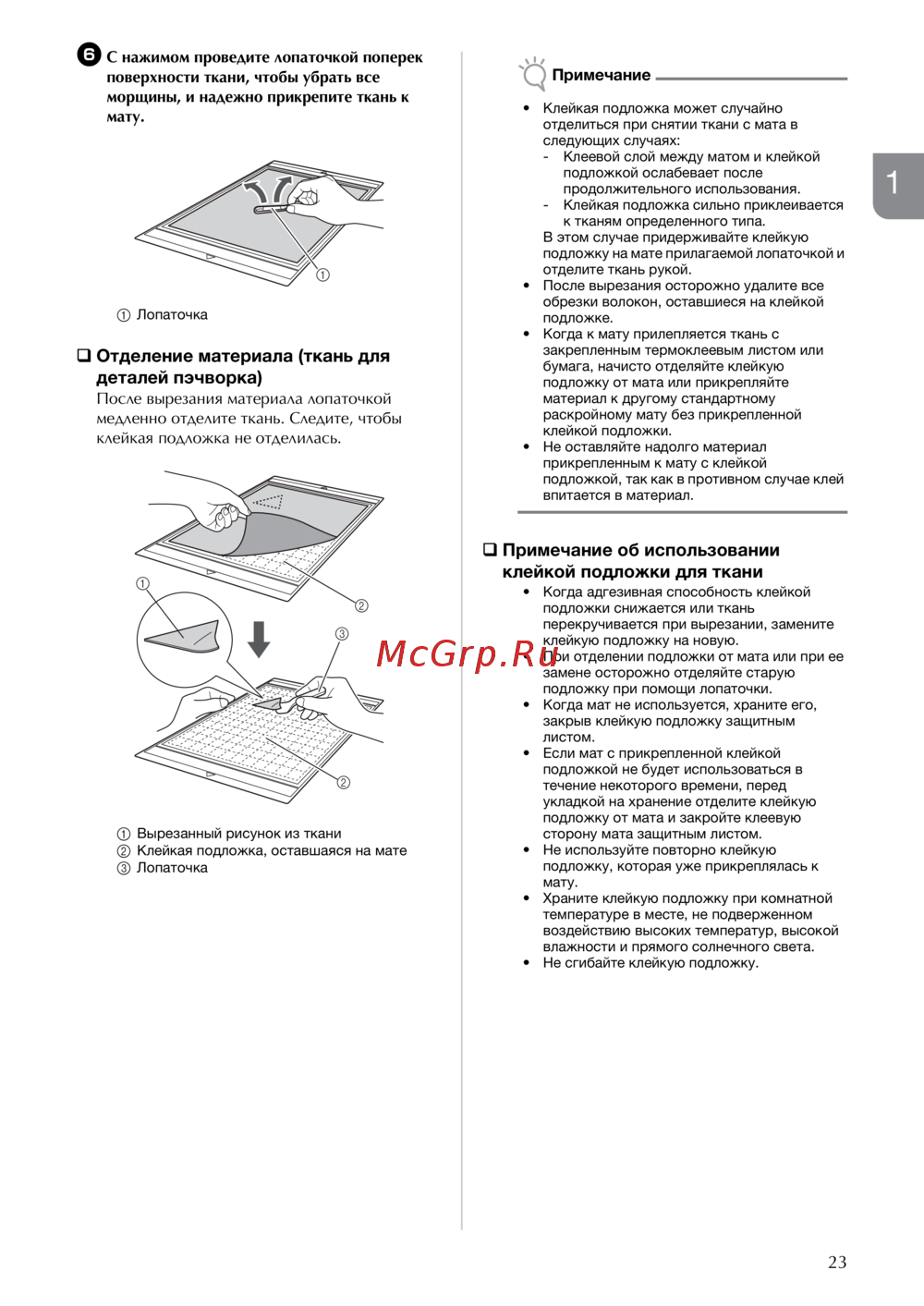 ![Brother CM900 [25/96] После вырезания материала лопаточкой медленно отделите ткань следите чтобы клейкая подложка не отделилась](/views2/1471081/page25/bg19.png)
