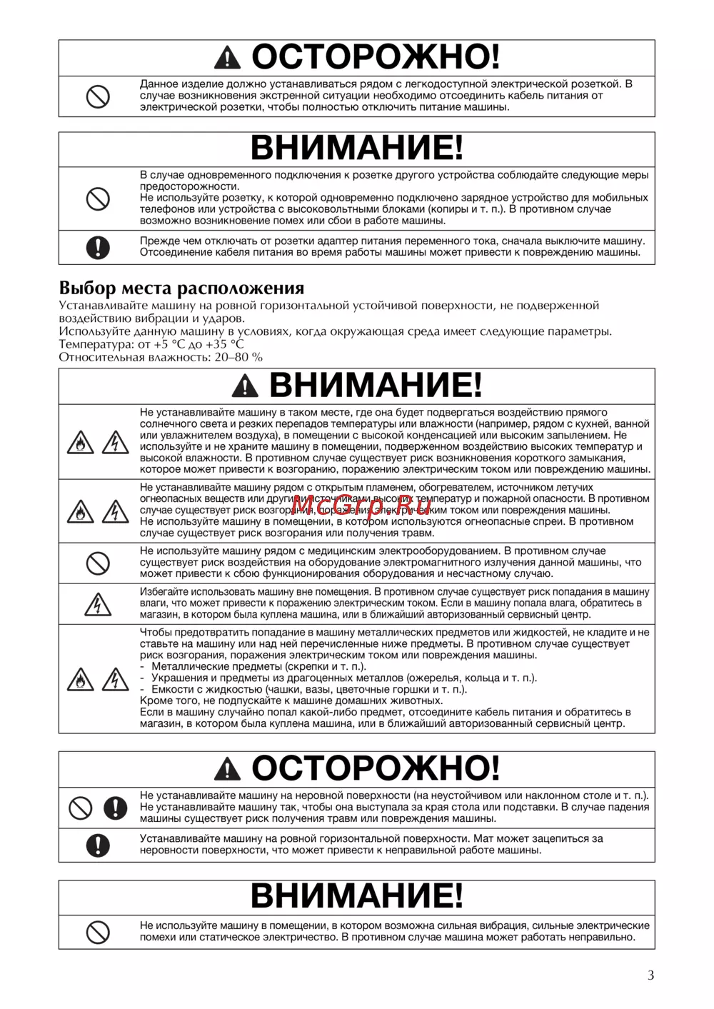 Не используйте машину в помещении, в котором возможна сильная вибрация, сильные электрические