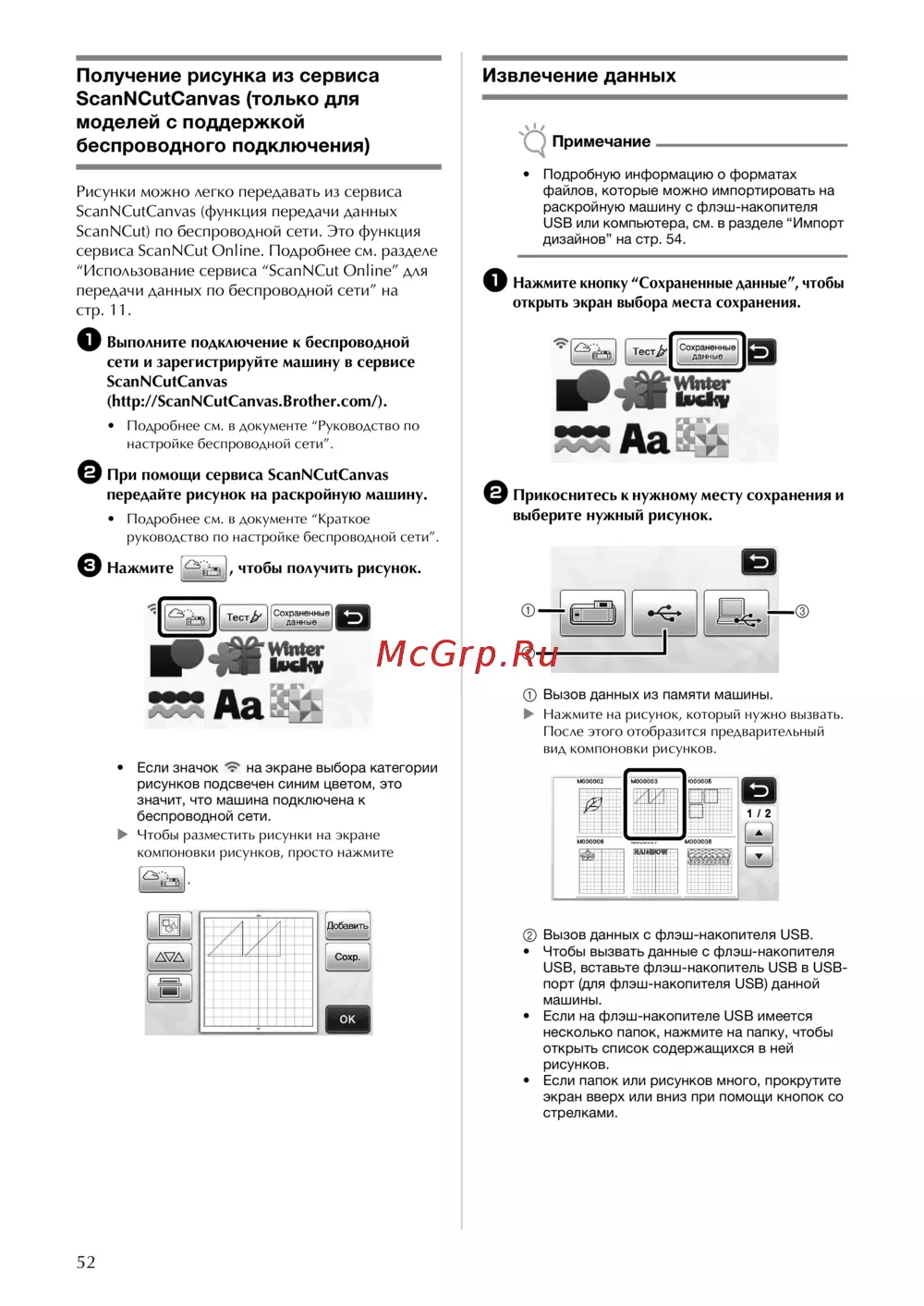 ![Brother CM700 [54/96] Рисунки можно легко передавать из сервиса scanncutcanvas функция передачи данных scanncut по беспроводной сети это функция сервиса scanncut online подробнее см разделе использование сервиса scanncut online для передачи данных по беспроводной сети на стр 11](/views2/1471081/page54/bg36.png)