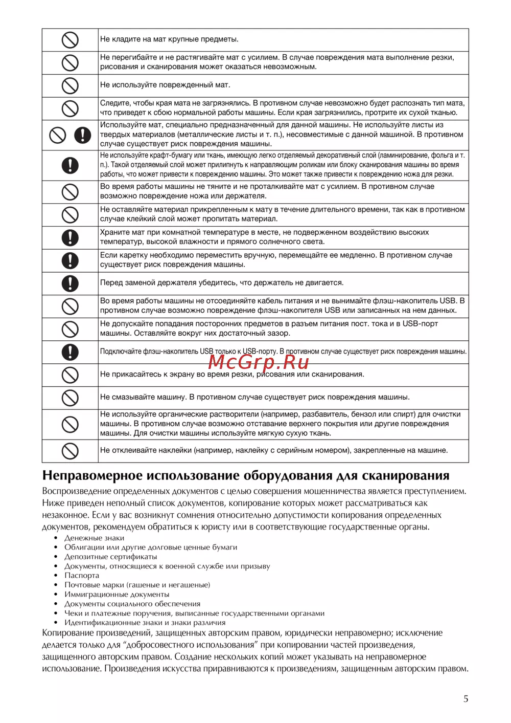 Во время работы машины не тяните и не проталкивайте мат с усилием. В противном случае