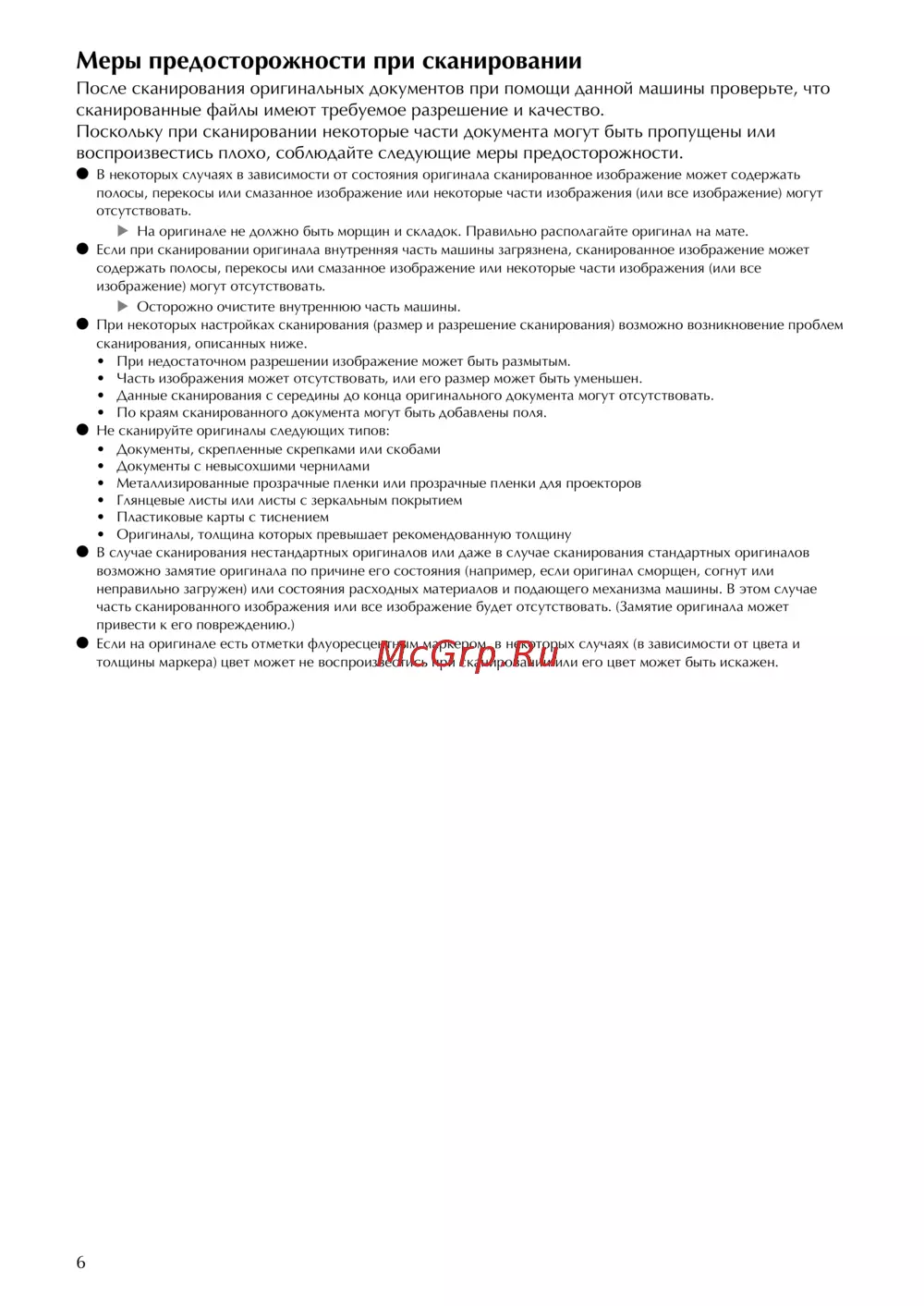 - После сканирования оригинальных документов при помощи данной машины проверьте что сканированные файлы имеют требуемое разрешение и качество поскольку при сканировании некоторые части документа могут быть пропущены или воспроизвестись плохо соблюдайте следующие меры предосторожности p.8