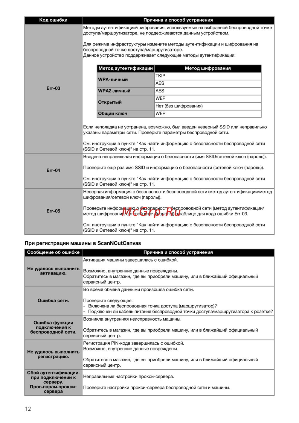 метод шифрования/сетевой ключ (пароль)) в таблице для кода ошибки Err-03.