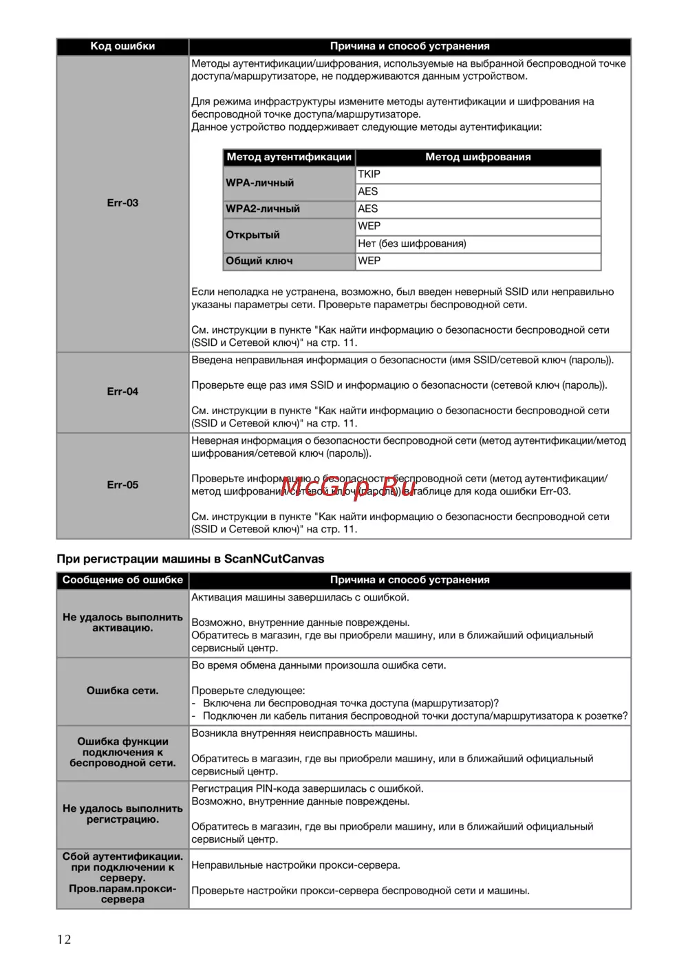 - В следующей таблице приведен список различных сообщений которые могут появляться во время настройки или во время регистрации машины в scanncutcanvas а также способы устранения соответствующих неполадок в случае появления сообщения об ошибке выполните инструкции приведенные в сообщении или операции описанные в данной таблице если проблема не исчезла обратитесь в магазин в котором была куплена машина или в ближайший авторизованный сервисный центр p.13
