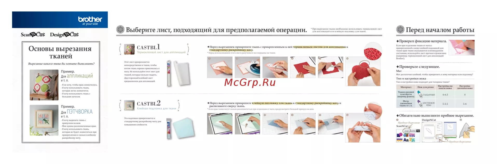 brother at your side Scarf Cuti Desigrf CutS Перед началом работы Выберите лист подходящий для предполагаемой операции Проверьте фиксацию материала Основы вырезания тканей Вырезание какого типа вы хотите выполнить CASTBL1 Если при отделении ткани от мата с прикрепленной к нему клейкой подложкой для ткани края ткани оказываются в неожиданном Термоклеевой лист для аппликаций э состоянии используйте лист прочного флизелина например термоклеевой лист для аппликаций Brother Этот лист прикрепляется непосредственно к ткани чтобы потом ткань хорошо приклеилась к Проверьте следующее Пример мату Не используйте этот лист для Мат для и т п тканей которые нельзя гладить Мат достаточно клейкий чтобы прикрепить к нему материал или подложку Двусторонний клейкий лист Тип и настройки ножа предназначен для аппликаций Тип и настройки ножа подходят для толщины ткани аппликаций Я не хочу чтобы края лохматились Материал Я хочу использовать ткань которая легко лохматится Ткани средней плотности например фланель Я хочу использовать ткань с большим начесом Пример ПЭТЧВОРКА Для И т п Я хочу вырезать ткань с припуском на шов Мне нужны разлохмаченные края Я хочу использовать ткань которая не будет лохматиться при прикреплении к сильно клейкому раскройному мату г1 CASTBL2 Г __И Клейкая е подложка для ткани s Перед вырезанием прикрепите клейкую подложку для ткани к стандартному раскройному мату и расположите сверху ткань Фетр джинсовая ткань и т и Нож для резки Мк СТАНДАРТНЫЙ ДЛЯ ГЛУБОКОЙ РЕЗКИ Настройка на шкале ножа Настройка давления ножа 4 6 5 4 5 5 5 5 6 Если края ткани могут сильно разлохматиться при отделении от мата предусмотрите большой припуск на шов Обязательно выполните пробное вырезание Эта подложка прикрепляется к стандартному раскройному мату для повышения клейкости