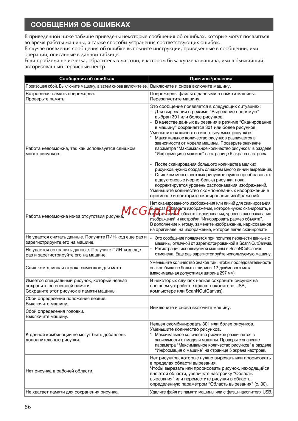 - В приведенной ниже таблице приведены некоторые сообщения об ошибках которые могут появляться во время работы машины а также способы устранения соответствующих ошибок в случае появления сообщения об ошибке выполните инструкции приведенные в сообщении или операции описанные в данной таблице если проблема не исчезла обратитесь в магазин в котором была куплена машина или в ближайший авторизованный сервисный центр p.88