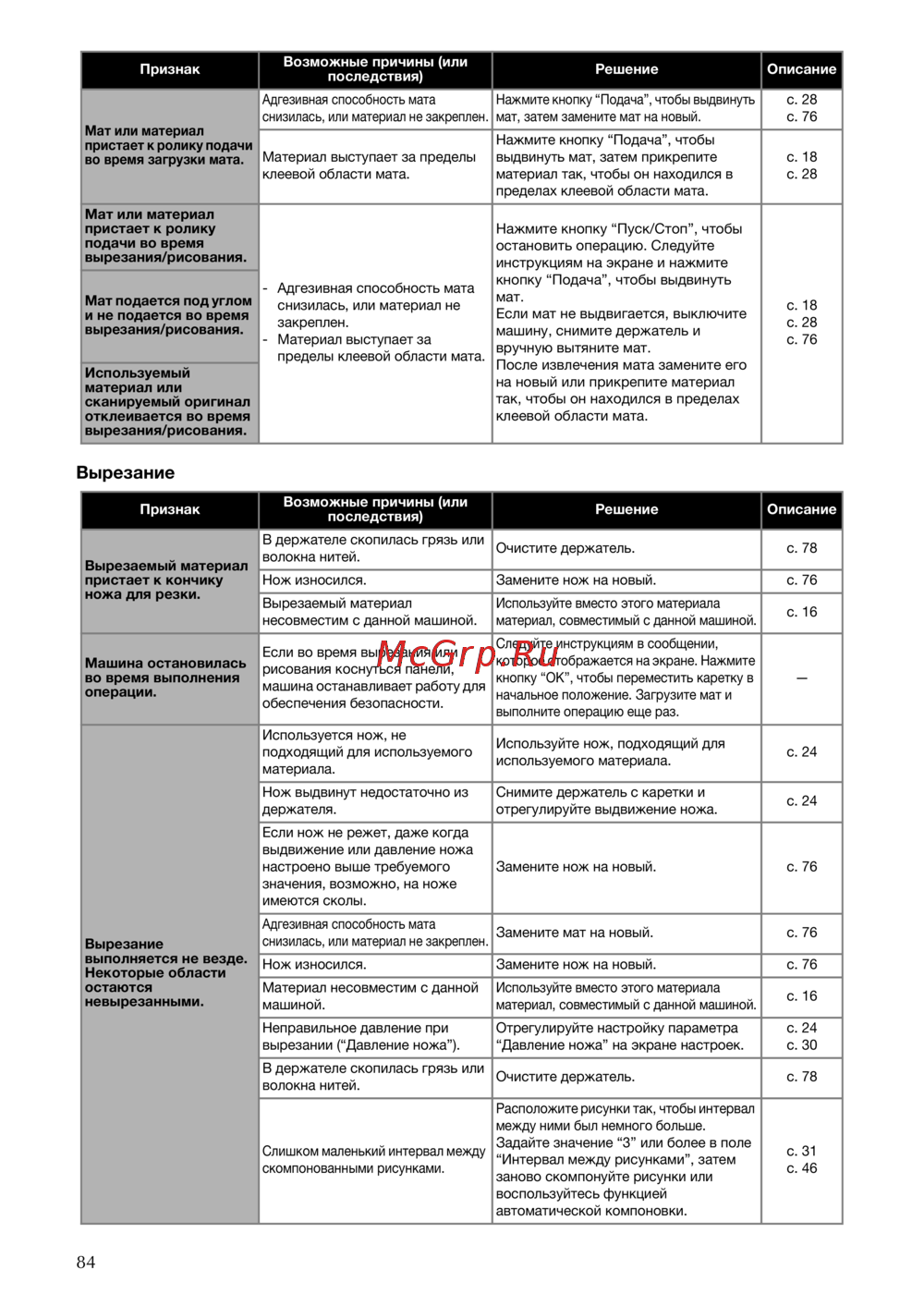 - Мат или материал пристает к ролику подачи во время вырезания рисования p.86