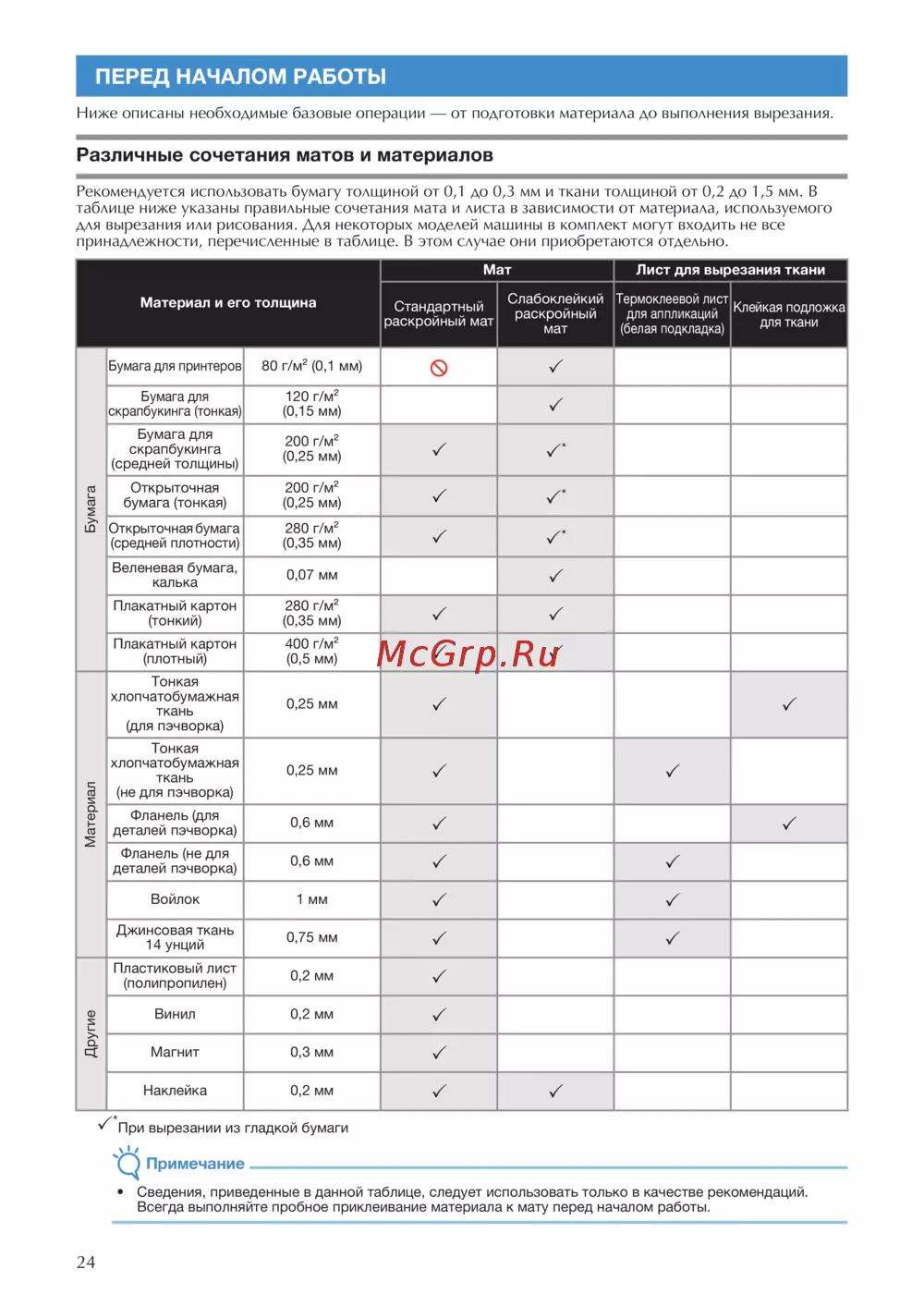![Brother DC100 [32/77] Рекомендуется использовать бумагу толщиной от 0 1 до 0 3 мм и ткани толщиной от 0 2 до 1 5 мм в таблице ниже указаны правильные сочетания мата и листа в зависимости от материала используемого для вырезания или рисования для некоторых моделей машины в комплект могут входить не все принадлежности перечисленные в таблице в этом случае они приобретаются отдельно](/views2/1471104/page32/bg20.png)