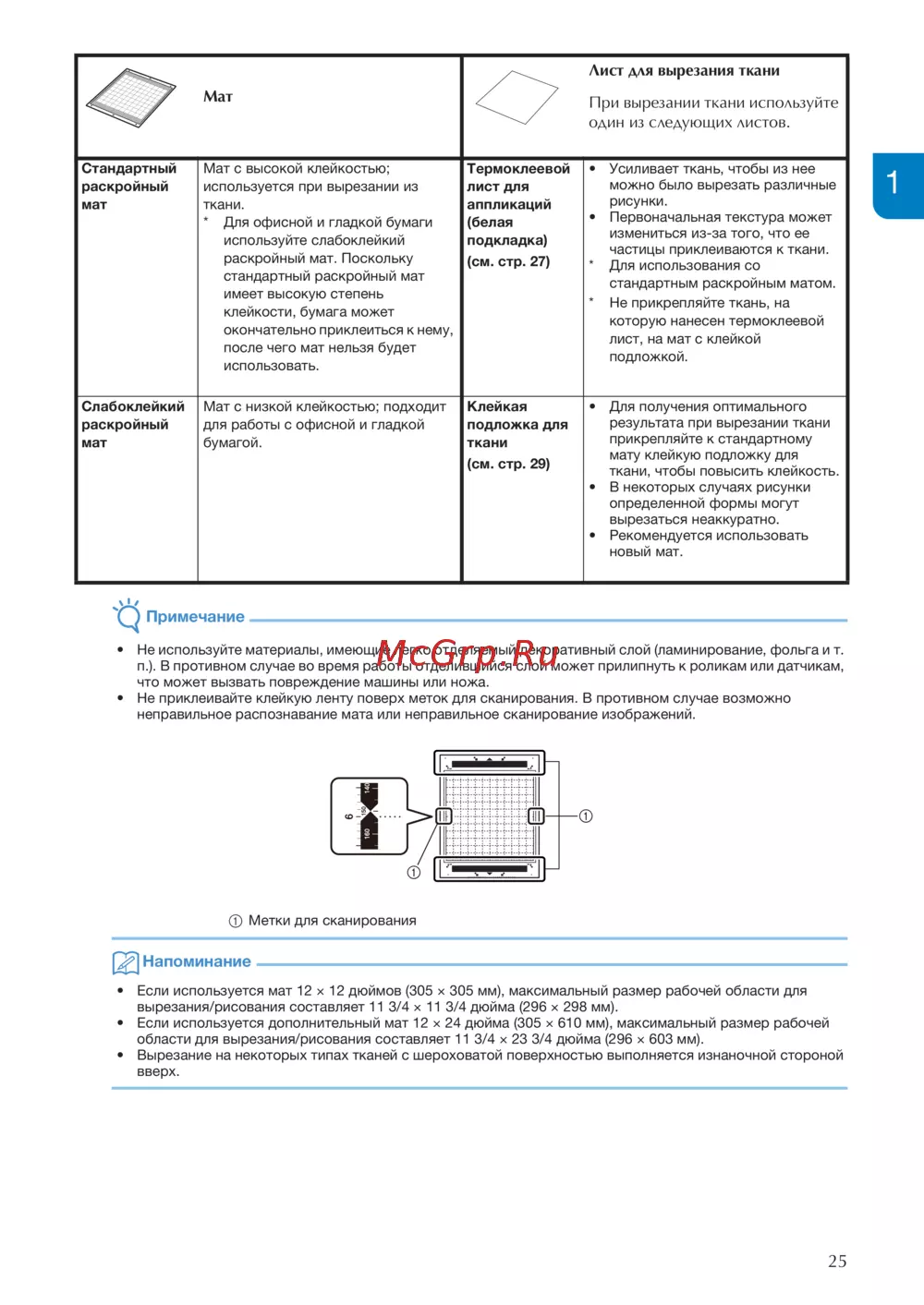 • Если используется мат 12 × 12 дюймов (305 × 305 мм), максимальный размер рабочей области для