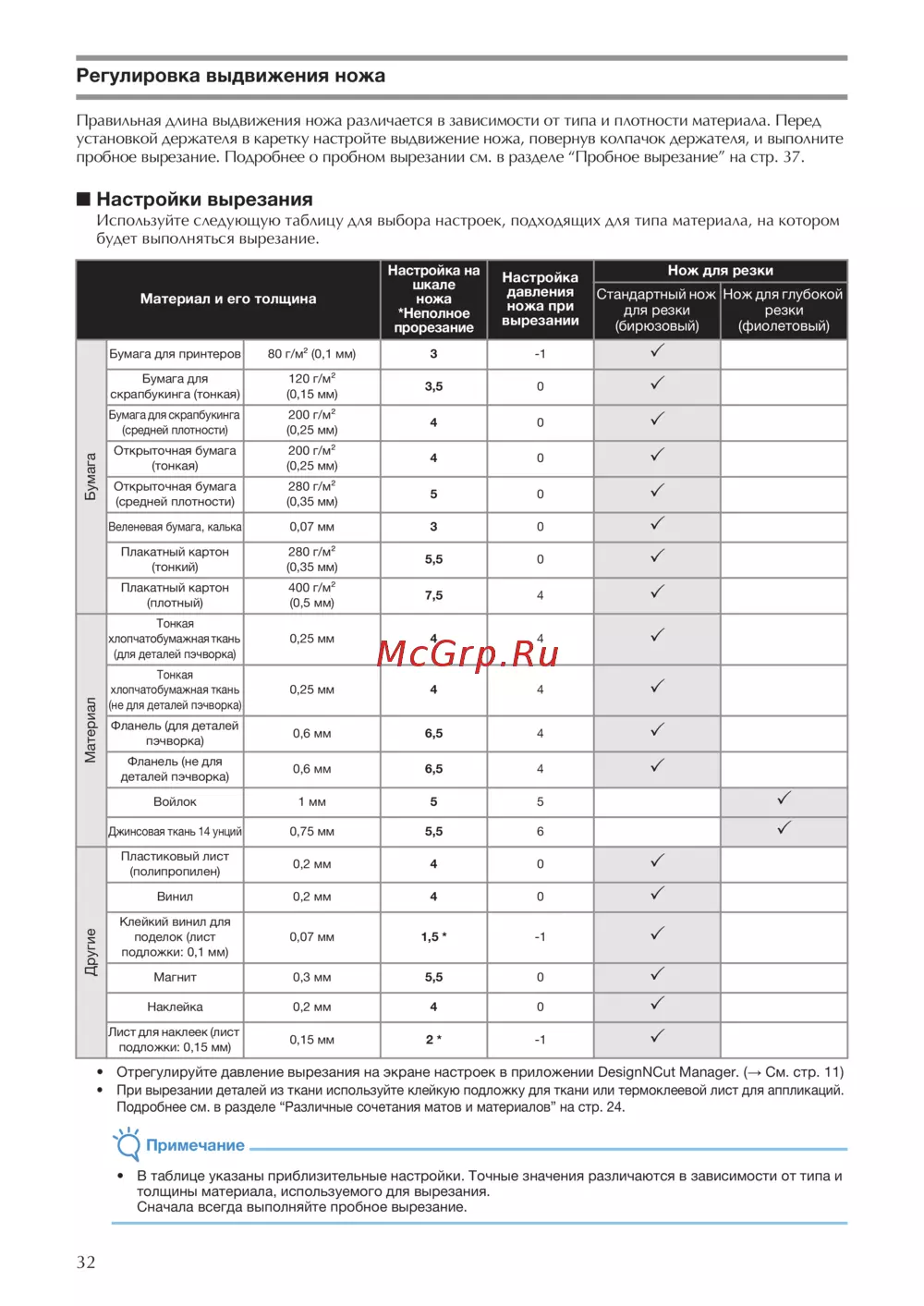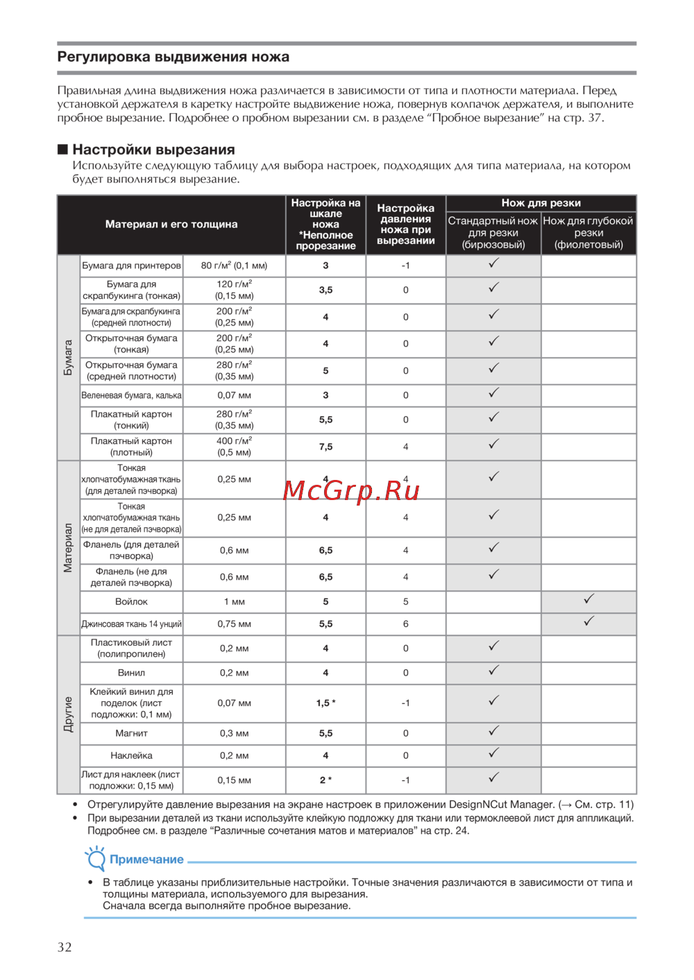 Используйте следующую таблицу для выбора настроек, подходящих для типа материала, на котором