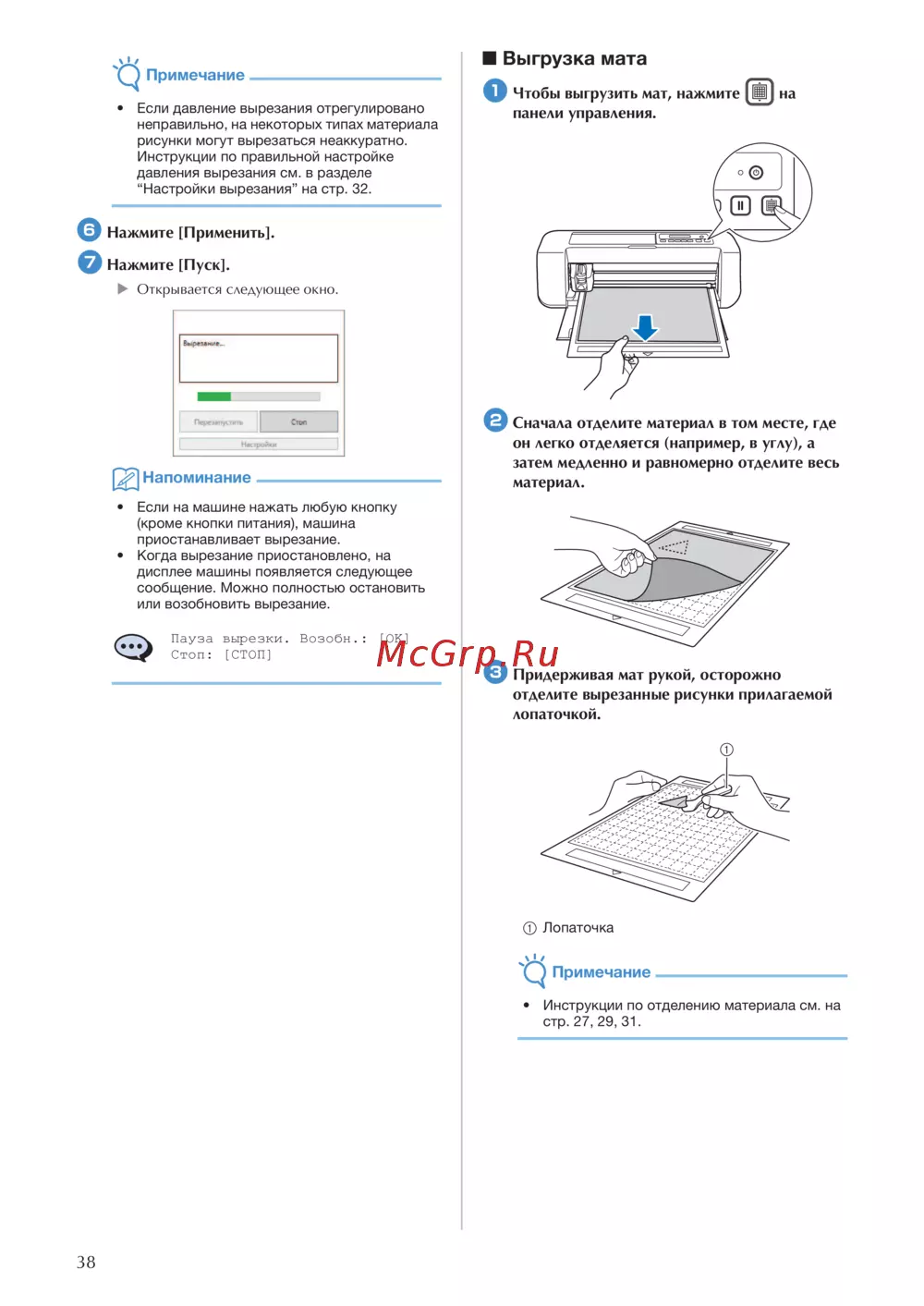 - Мат подается под углом и не подается во время вырезания рисования p.65