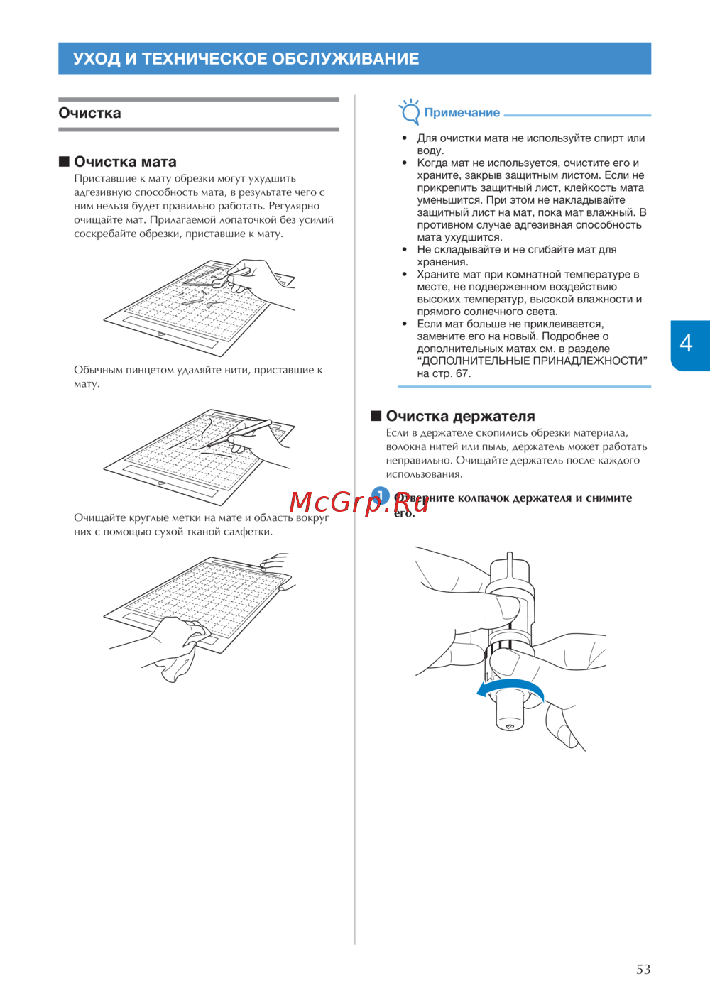 Brother DC100 — правильная очистка и уход за рабочими матами и держателями [61/77]
