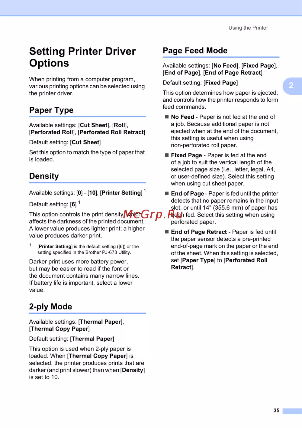 Brother PJ-673 — настройки драйвера принтера: выбор бумаги и плотности печати [39/75]