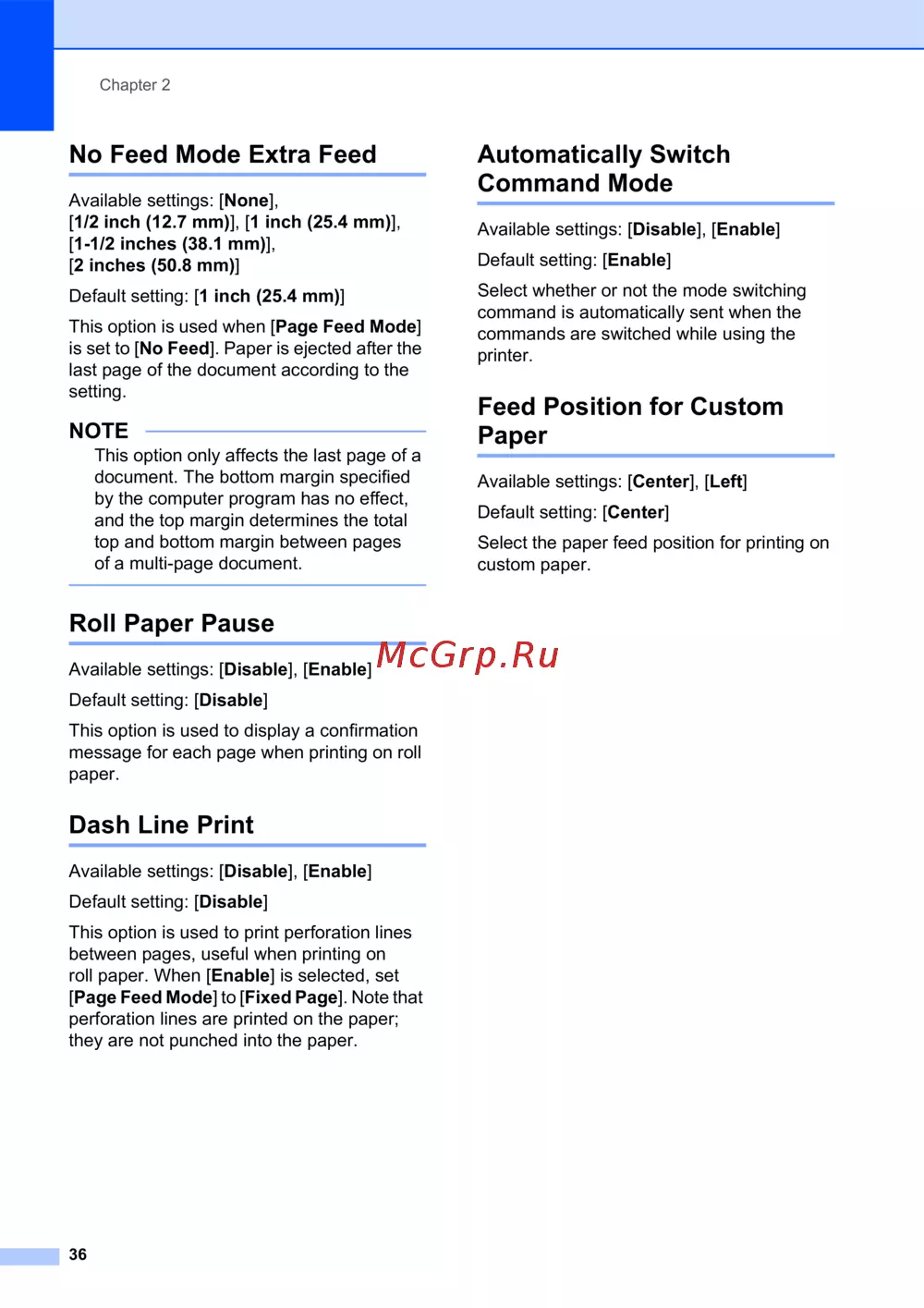 Изучите доступные настройки печати, включая режимы подачи бумаги, параметры для рулонной бумаги и печати с перфорацией. Оптимизируйте процесс печати с помощью этих функций.