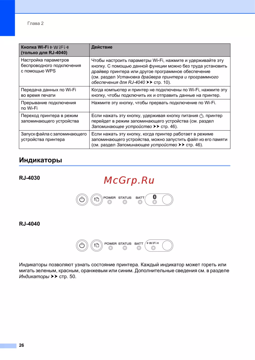 Brother RJ-4030 — индикаторы состояния принтера и управление Wi-Fi подключением [30/64]