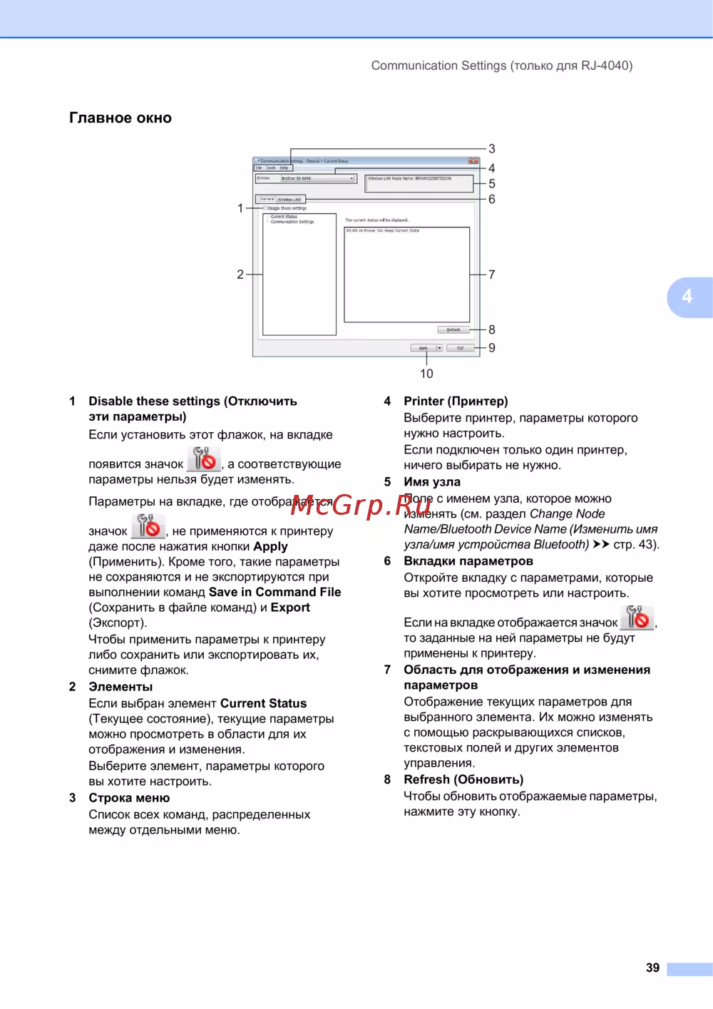 Brother RJ-4030 — настройки связи для принтера: управление параметрами и состоянием [43/64]