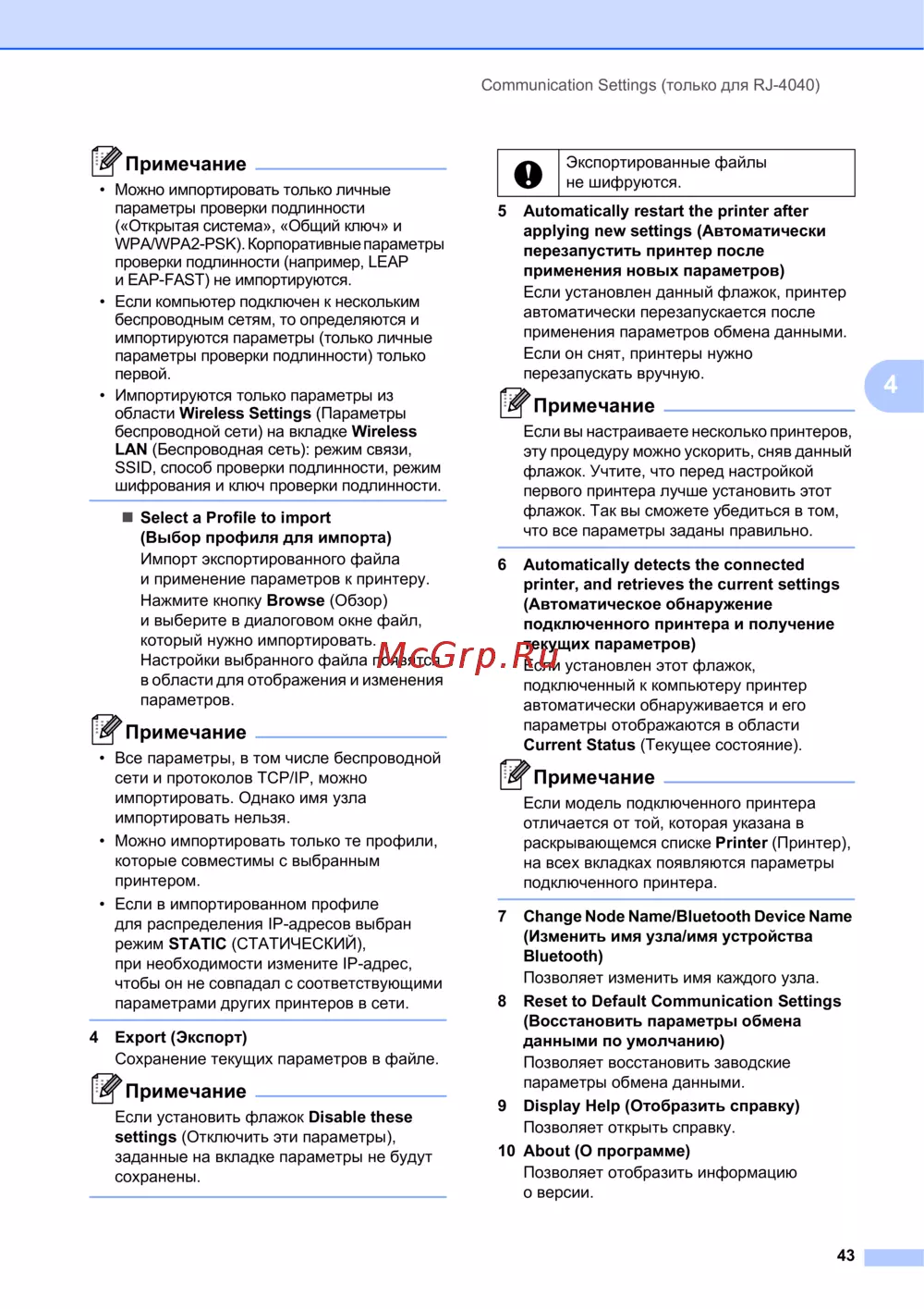 Brother RJ-4030 — настройки связи для беспроводных принтеров: импорт и экспорт параметров [47/64]