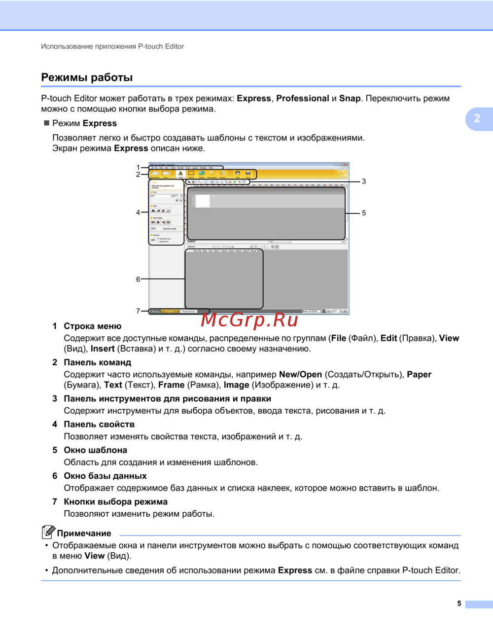 P-touch Editor может работать в трех режимах: Express, Professional и Snap. Переключить режим