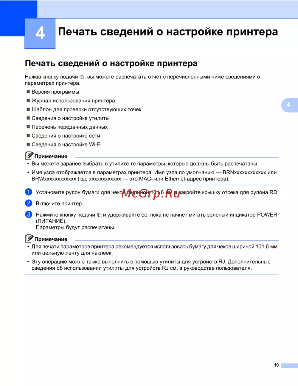 • Для печати параметров принтера рекомендуется использовать бумагу для чеков шириной 101,6 мм