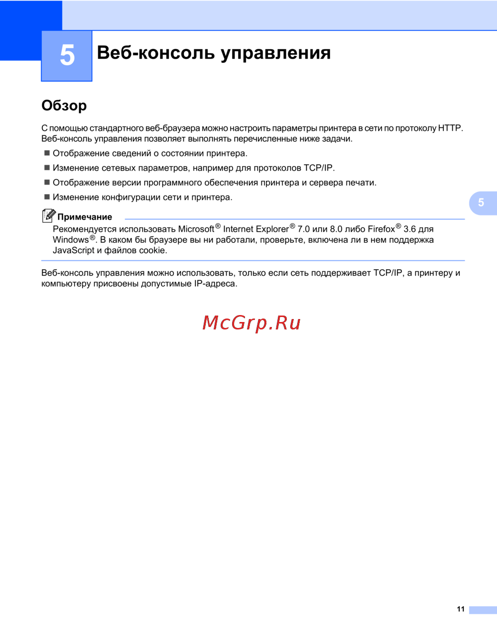 Веб-консоль управления можно использовать, только если сеть поддерживает TCP/IP, а принтеру и