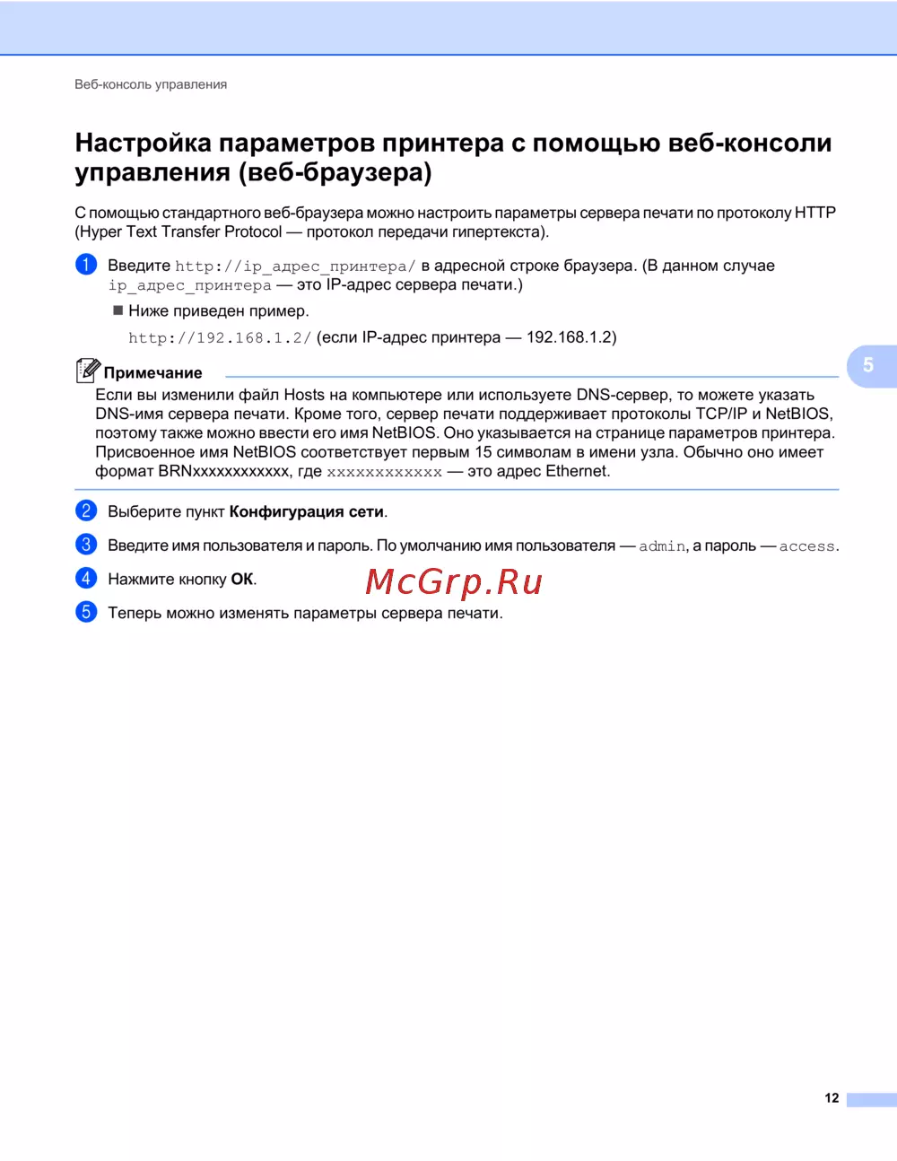 С помощью стандартного веб-браузера можно настроить параметры сервера печати по протоколу HTTP