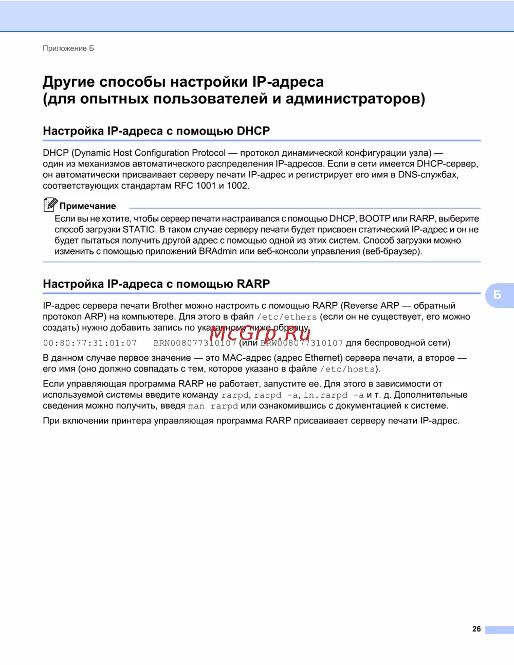 Brother RJ-4040 — настройка IP-адреса для серверов печати: DHCP и RARP [30/33]