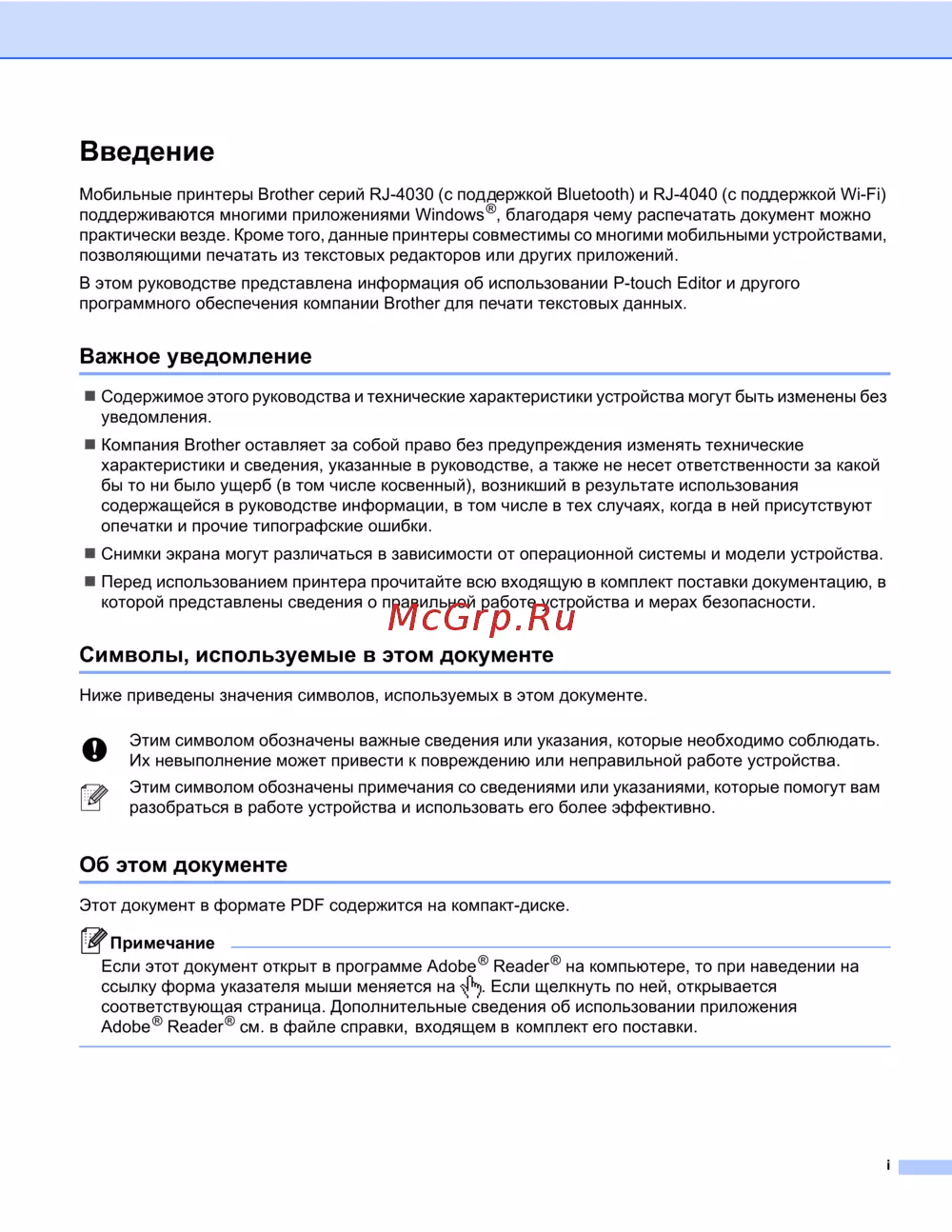 ![Brother RJ-4040 [2/41] Символы используемые в этом документе](/views2/1471117/page2/bg2.png)