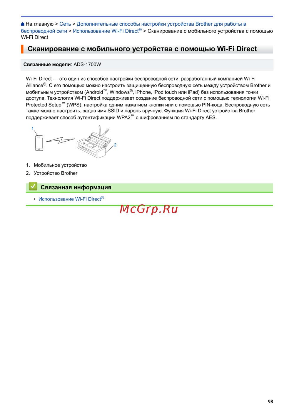 Brother ADS-1200 — настройка устройства для сканирования через Wi-Fi Direct [102/223]