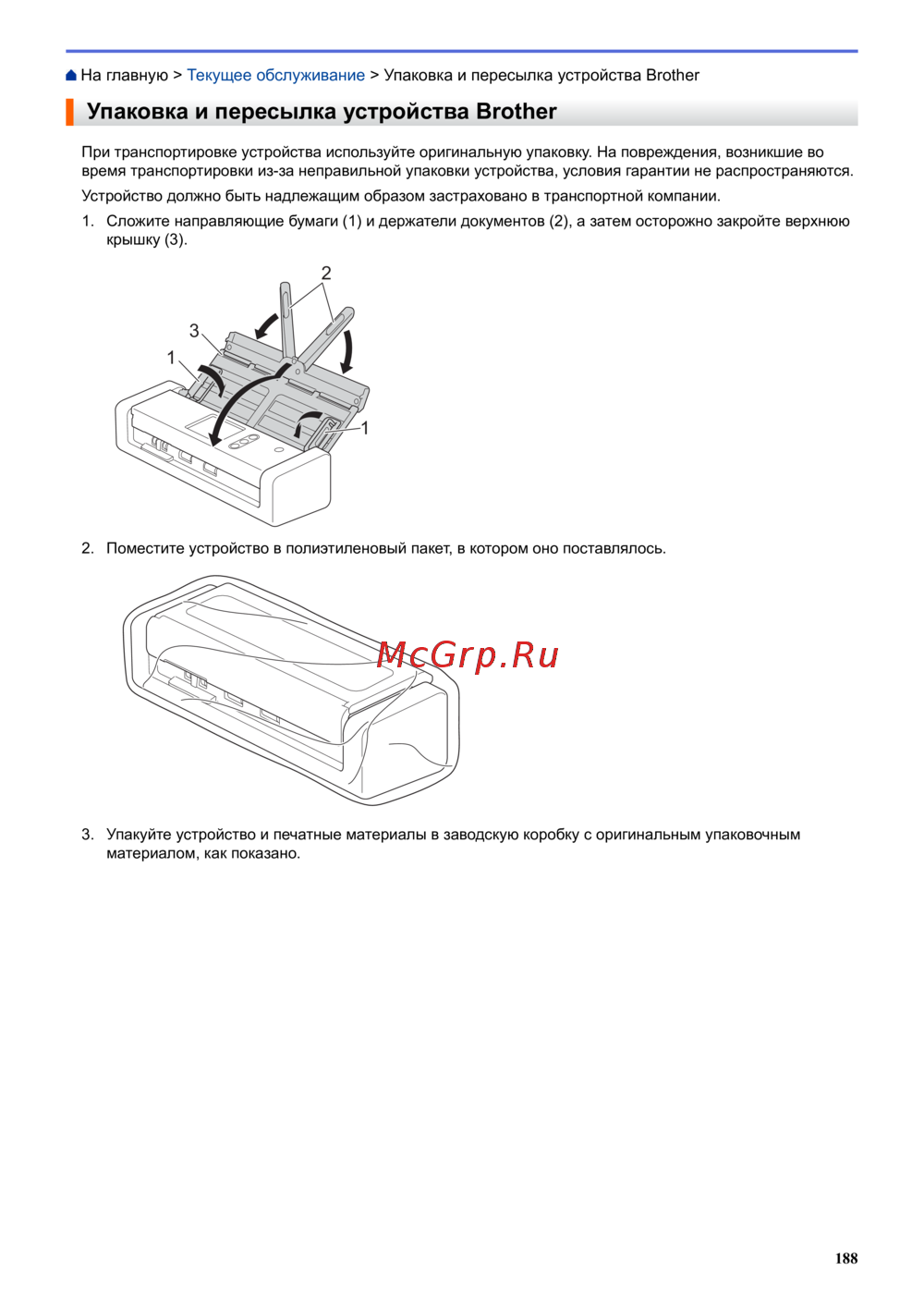 Brother ADS-1200 — правильная упаковка и пересылка устройства для безопасной транспортировки [192/223]