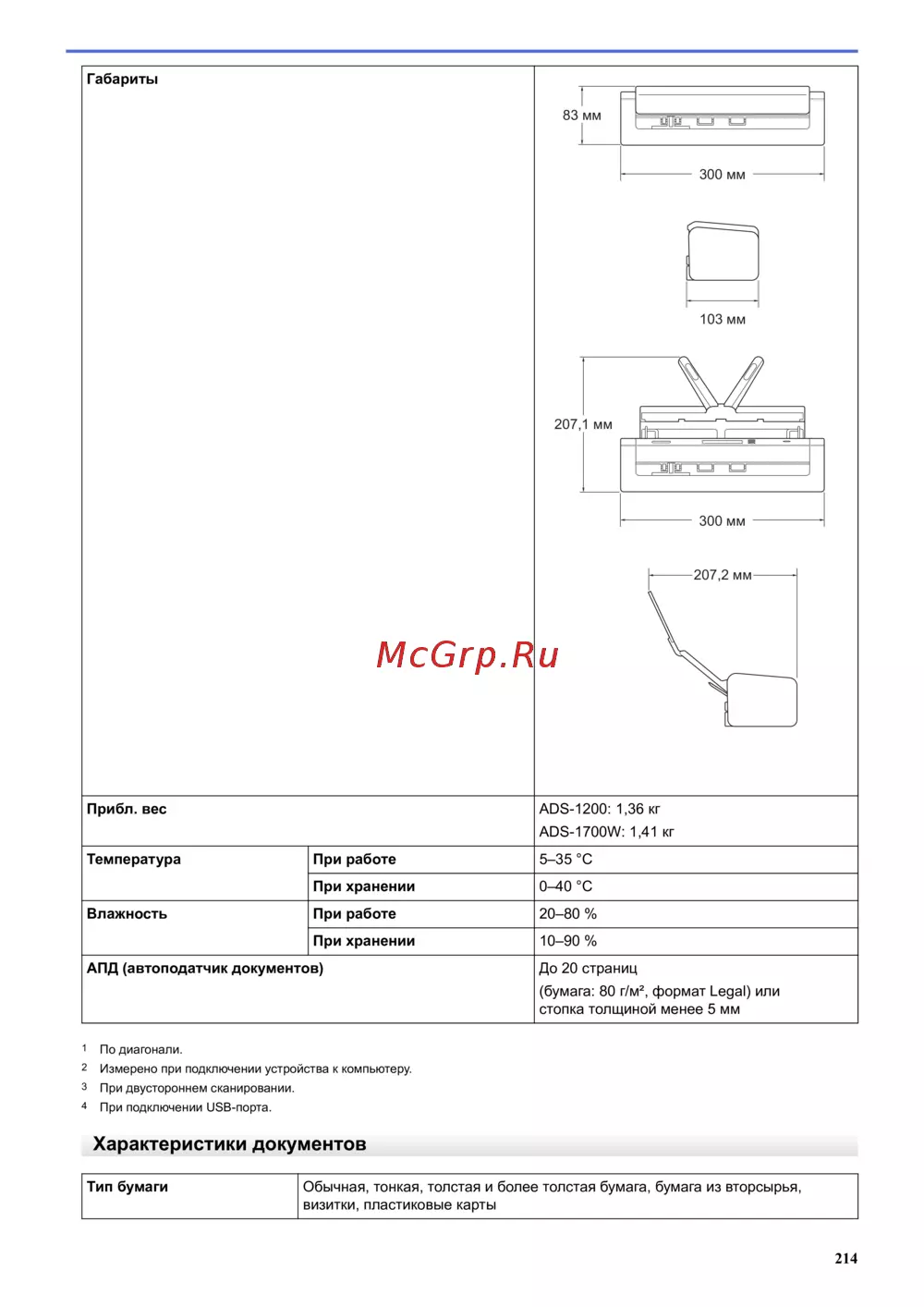 Brother ADS-1200 — технические характеристики и габариты сканеров для документов [218/223]