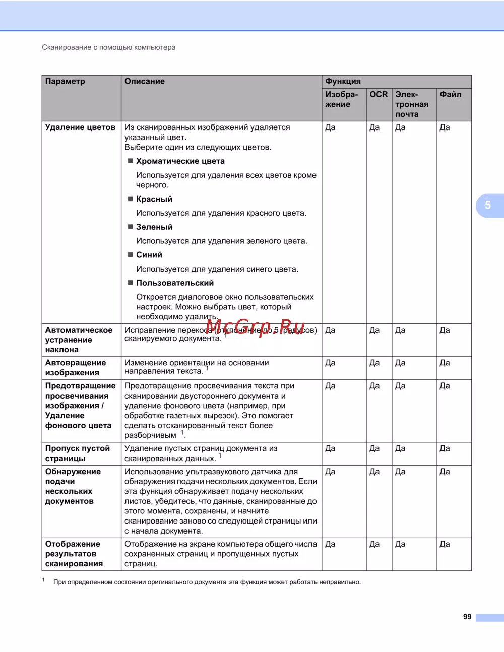Изучите функции сканирования, включая удаление цветов, автоматическое устранение наклона и предотвращение просвечивания. Оптимизируйте процесс сканирования документов.