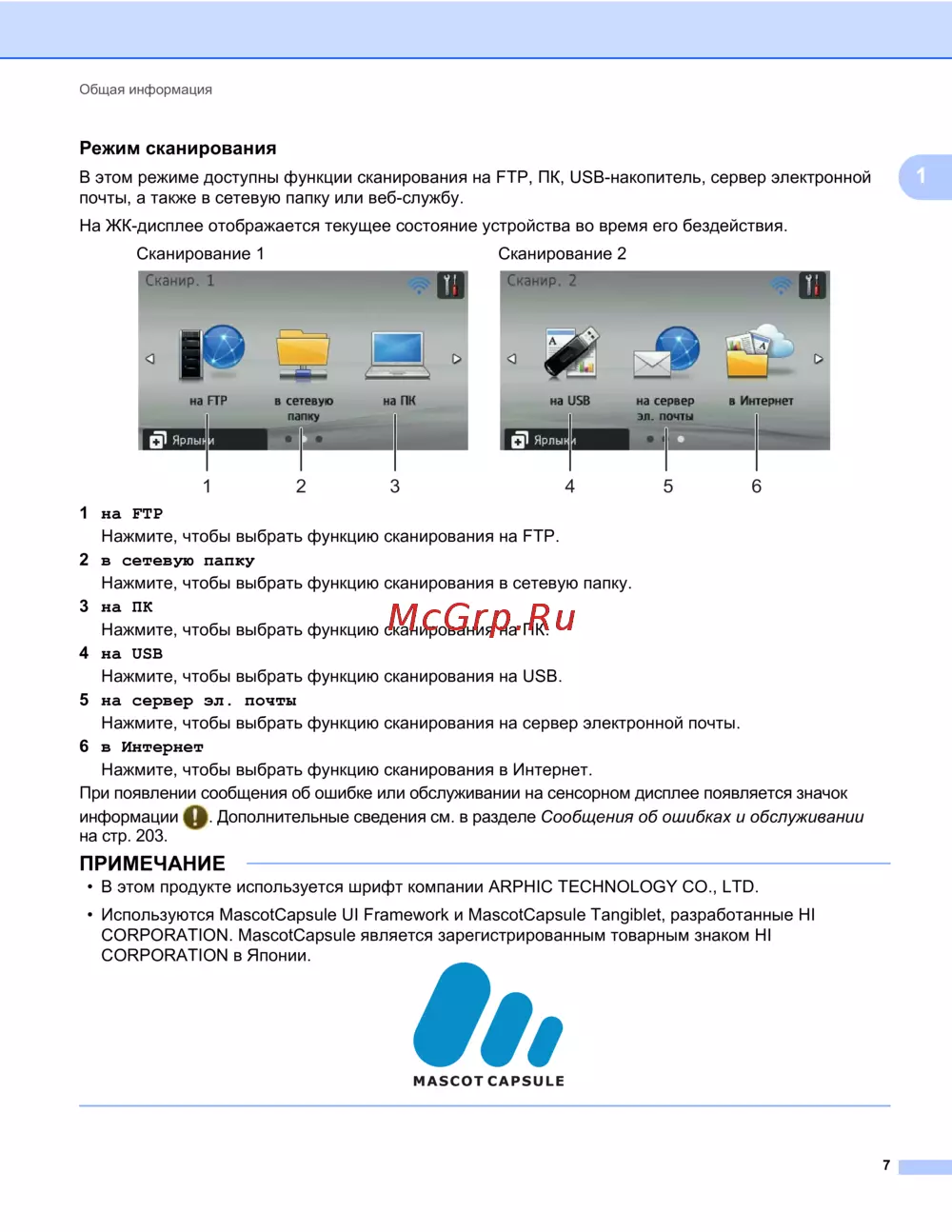 Узнайте о режимах сканирования на FTP, ПК, USB-накопителе и сервере электронной почты. Получите информацию о текущем состоянии устройства и возможных ошибках.