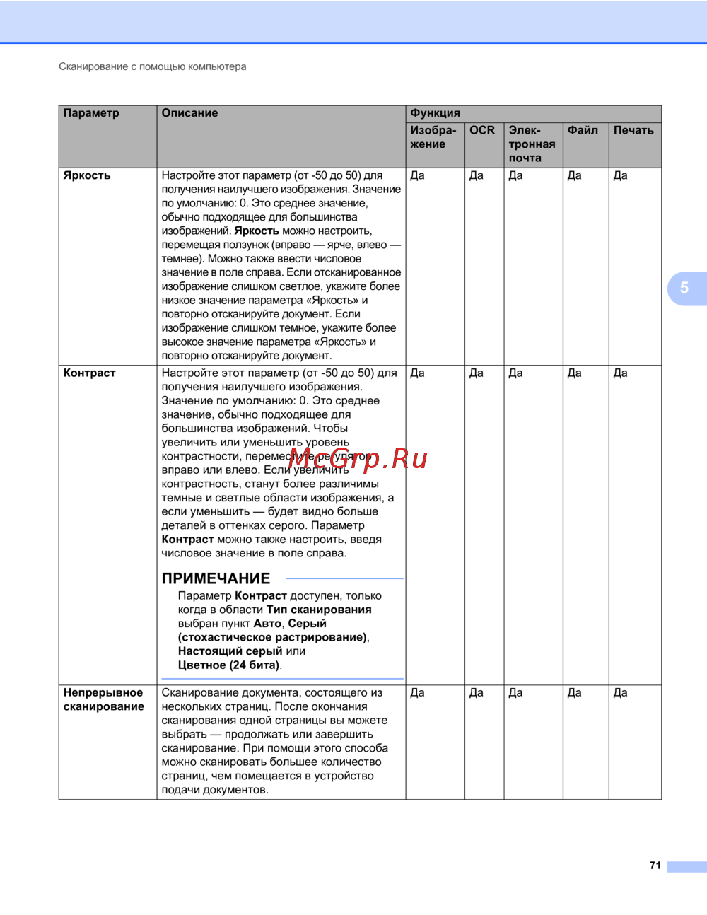 Brother ADS-2100e — настройки сканирования: яркость, контраст и непрерывное сканирование [84/252]