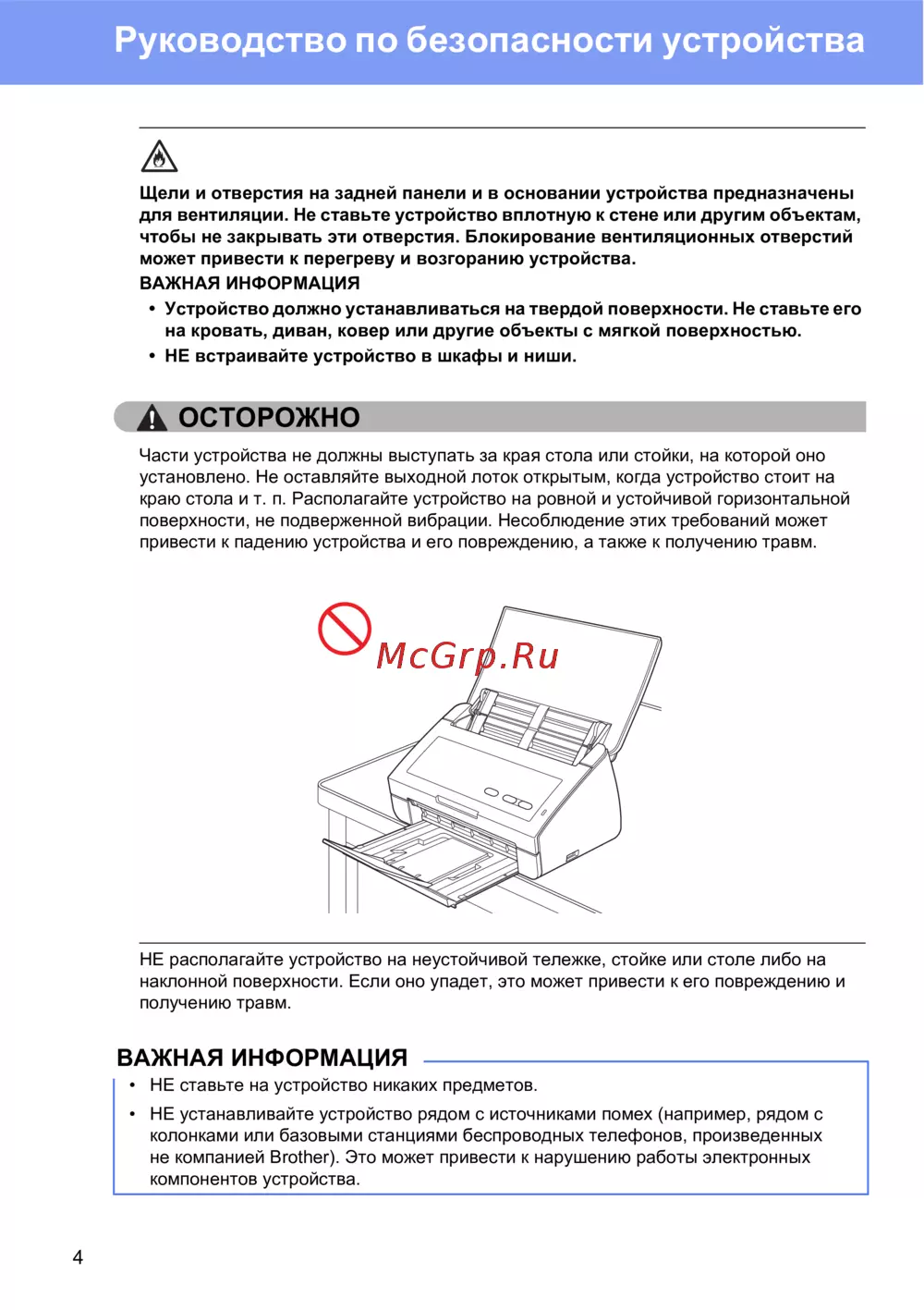 Brother ADS-2100e — руководство по безопасности установки устройства для предотвращения перегрева [4/23]