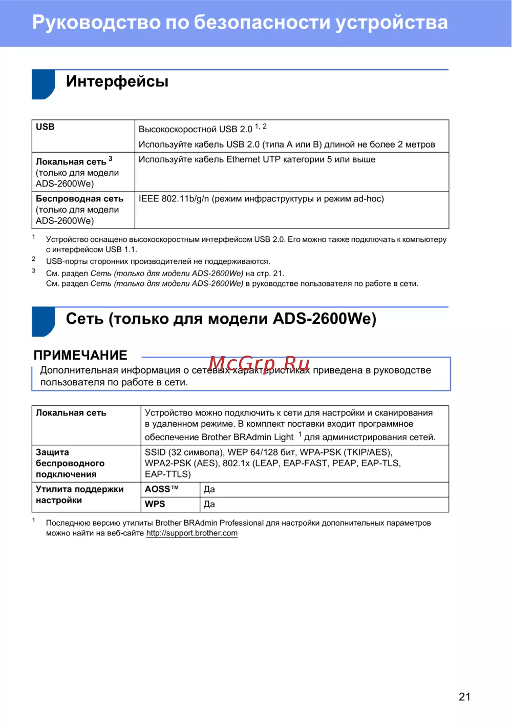 Brother ADS-2600We — руководство по безопасности устройства и настройке сетевых интерфейсов [21/23]