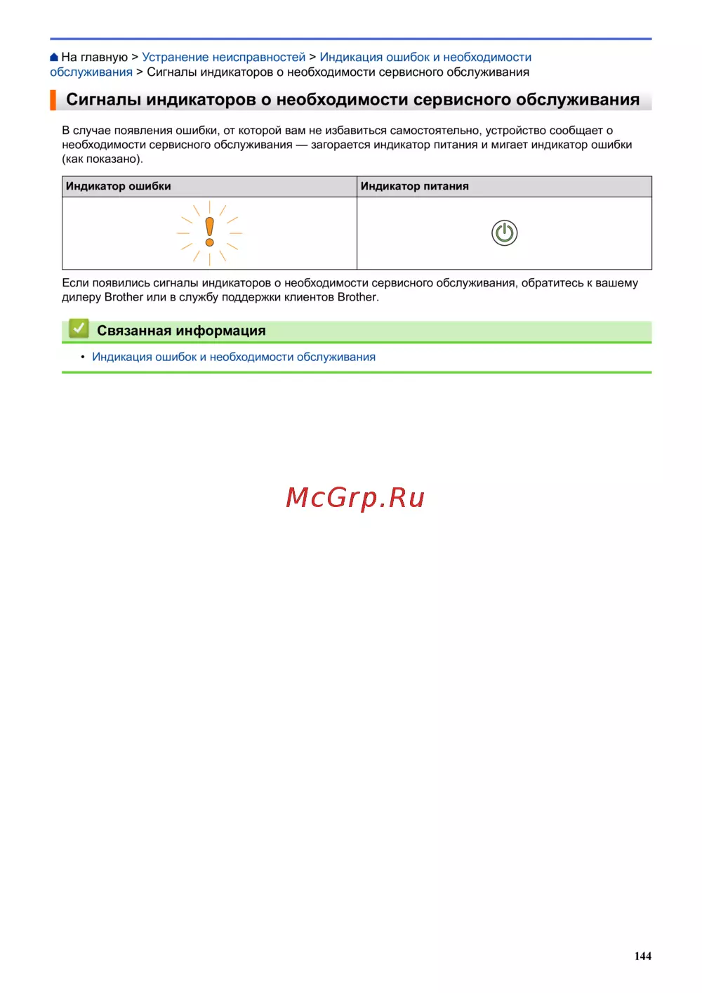 необходимости сервисного обслуживания — загорается индикатор питания и мигает индикатор ошибки