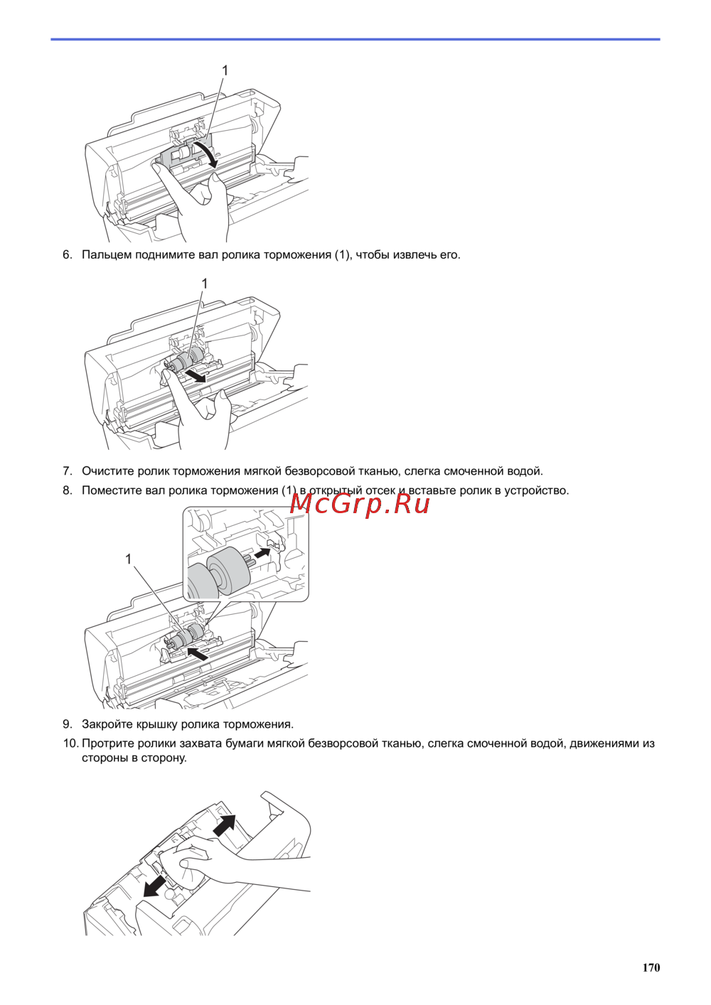 10. Протрите ролики захвата бумаги мягкой безворсовой тканью, слегка смоченной водой, движениями из