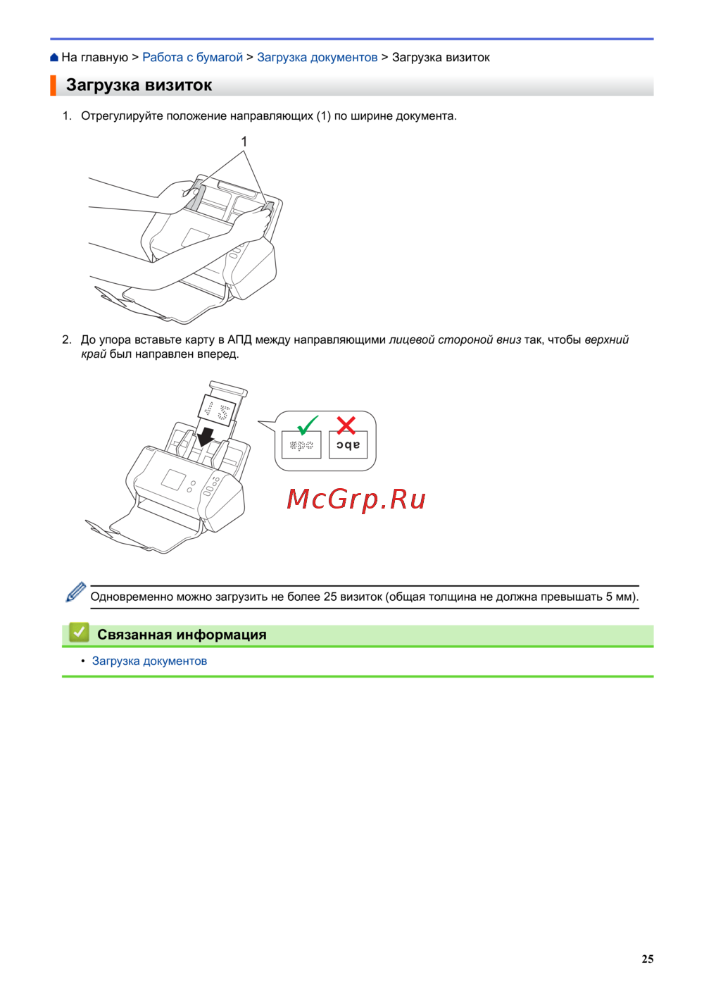 Одновременно можно загрузить не более 25 визиток (общая толщина не должна превышать 5 мм).