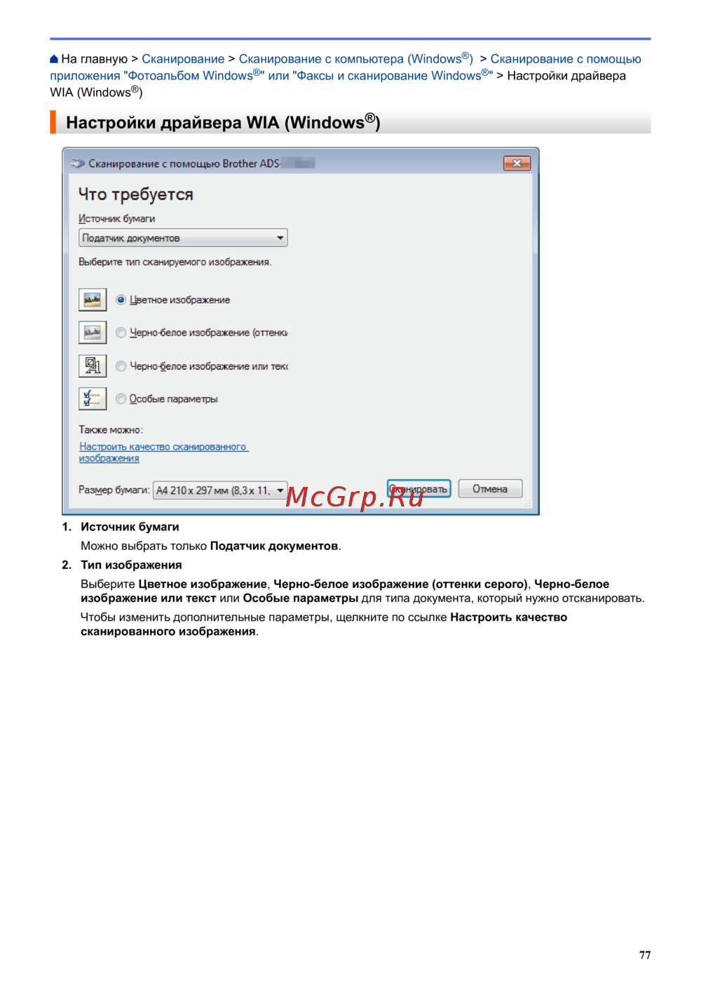 Узнайте, как настроить драйвер WIA для сканирования документов с компьютера. Выберите источник бумаги и тип изображения для оптимального результата.