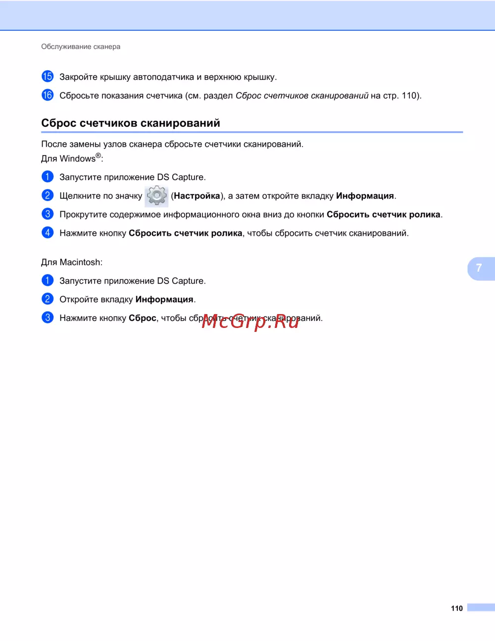 Узнайте, как правильно обслуживать сканер и сбрасывать счетчики сканирований на Windows и Macintosh. Подробные шаги для эффективного использования устройства.
