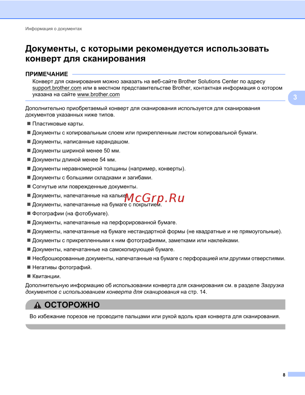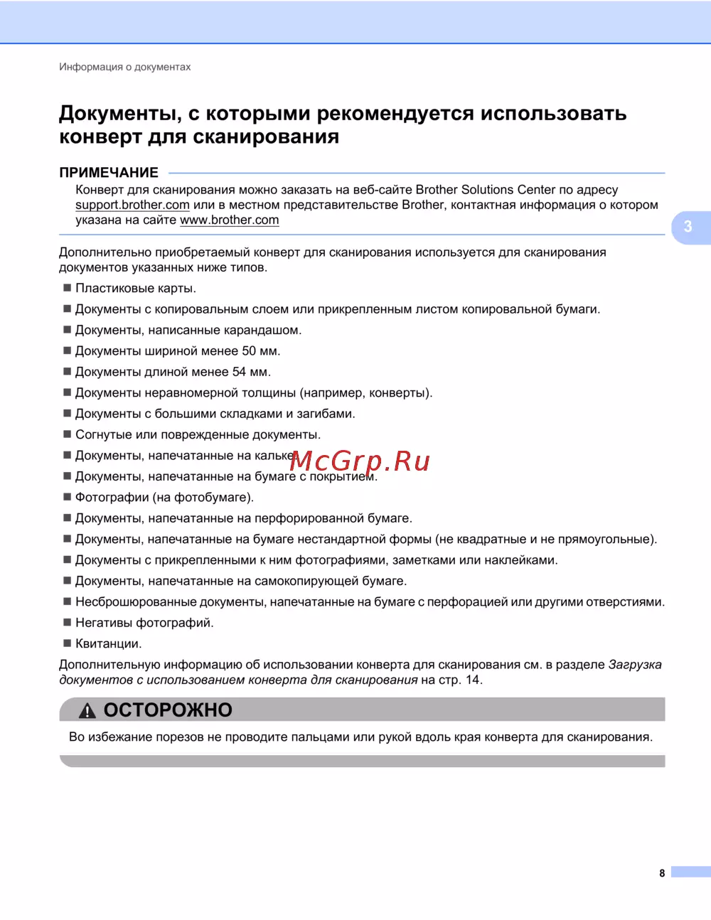 Во избежание порезов не проводите пальцами или рукой вдоль края конверта для сканирования.