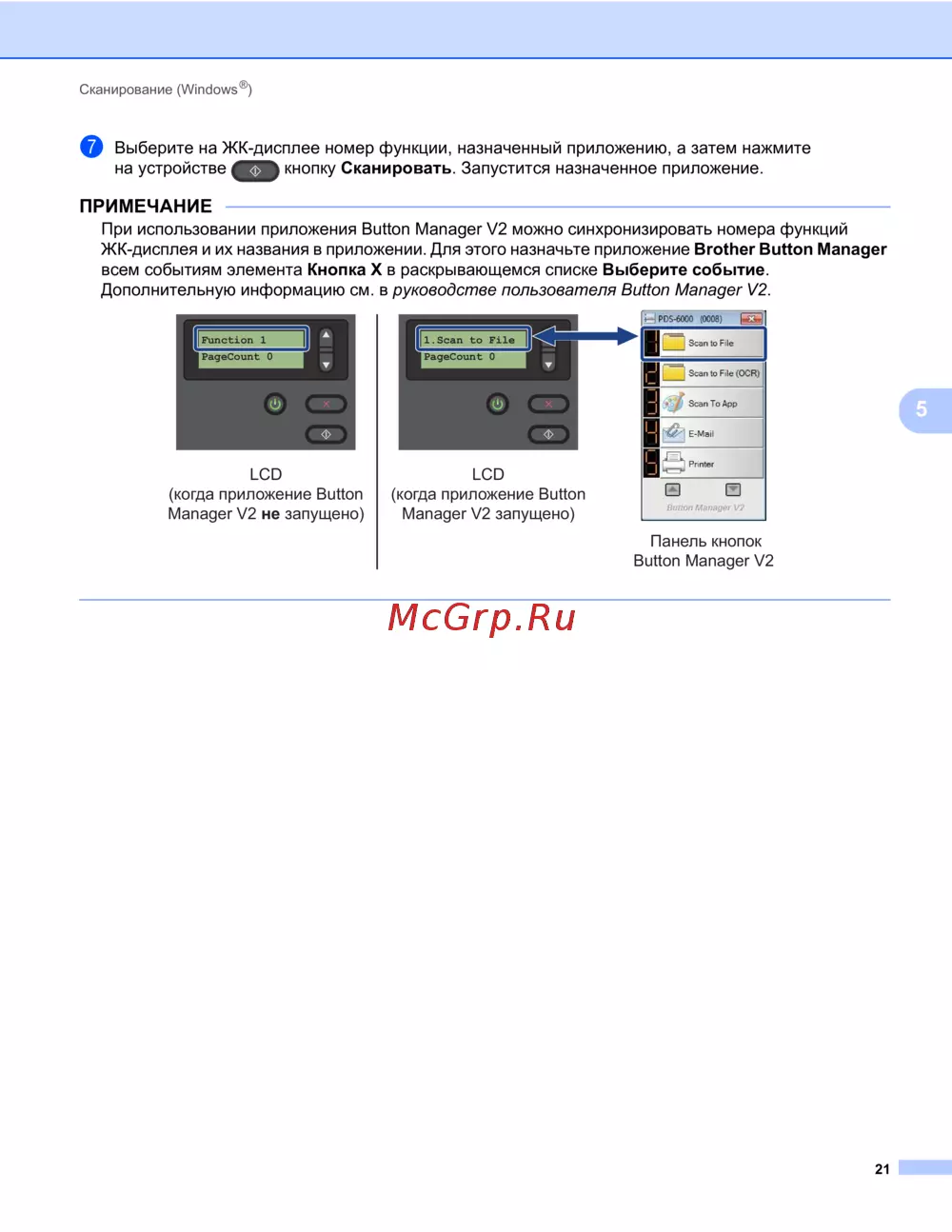 - Если на компьютере запущено приложение button manager то вместо сообщения function x функция x будет отображаться номер и название функции button manager дополнительную информацию см в руководстве пользователя button manager v2 чтобы загрузить руководство пользователя button manager v2 перейдите на страницу руководств веб сайта brother solutions center по адресу support brother com p.9
