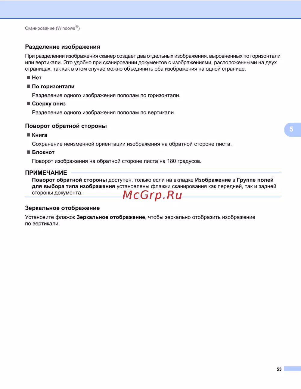 Узнайте о функциях сканирования, включая разделение изображений и поворот обратной стороны. Оптимизируйте процесс сканирования документов с помощью удобных настроек.
