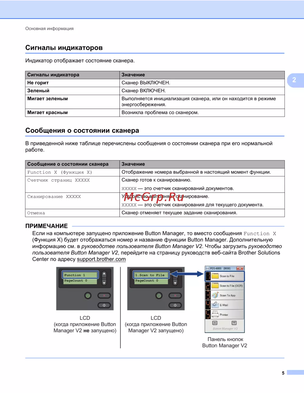 - Если на компьютере запущено приложение button manager то вместо сообщения function x функция x будет отображаться номер и название функции button manager дополнительную информацию см в руководстве пользователя button manager v2 чтобы загрузить руководство пользователя button manager v2 перейдите на страницу руководств веб сайта brother solutions center по адресу support brother com p.9