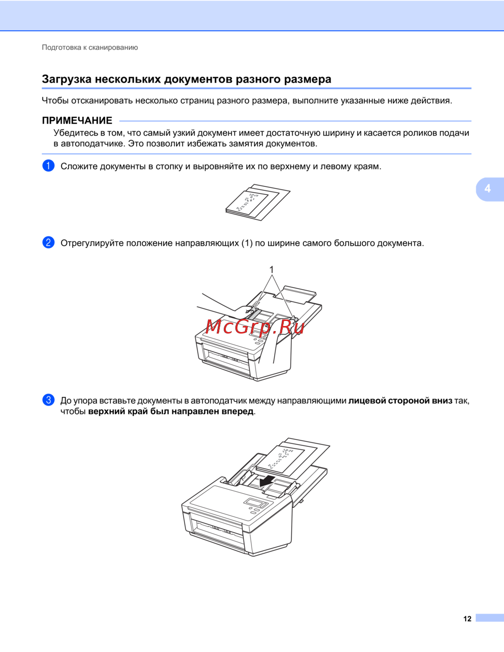 - Отрегулируйте положение направляющих по ширине документа если при сканировании многостраничного документа со страницами разных форматов для параметра кадрирование выбрано значение автоматически выравнивание включено вставляйте узкие страницы прямо и как можно ближе к середине устройства если документ не подается прямо используйте функцию непрерывное сканирование p.127