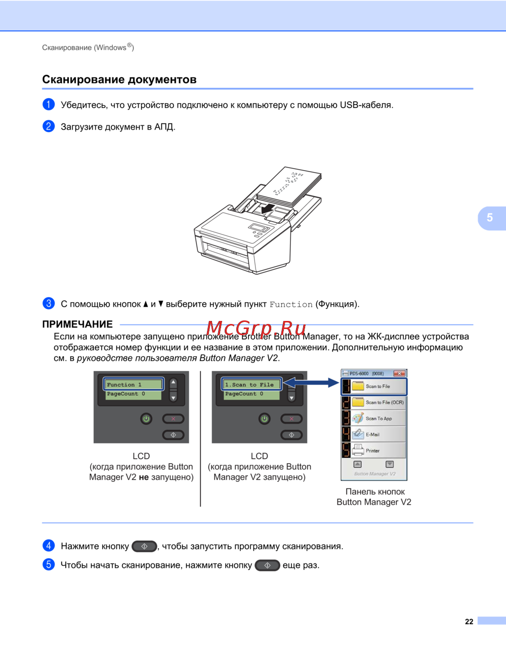 - Если на компьютере запущено приложение button manager то вместо сообщения function x функция x будет отображаться номер и название функции button manager дополнительную информацию см в руководстве пользователя button manager v2 чтобы загрузить руководство пользователя button manager v2 перейдите на страницу руководств веб сайта brother solutions center по адресу support brother com p.9