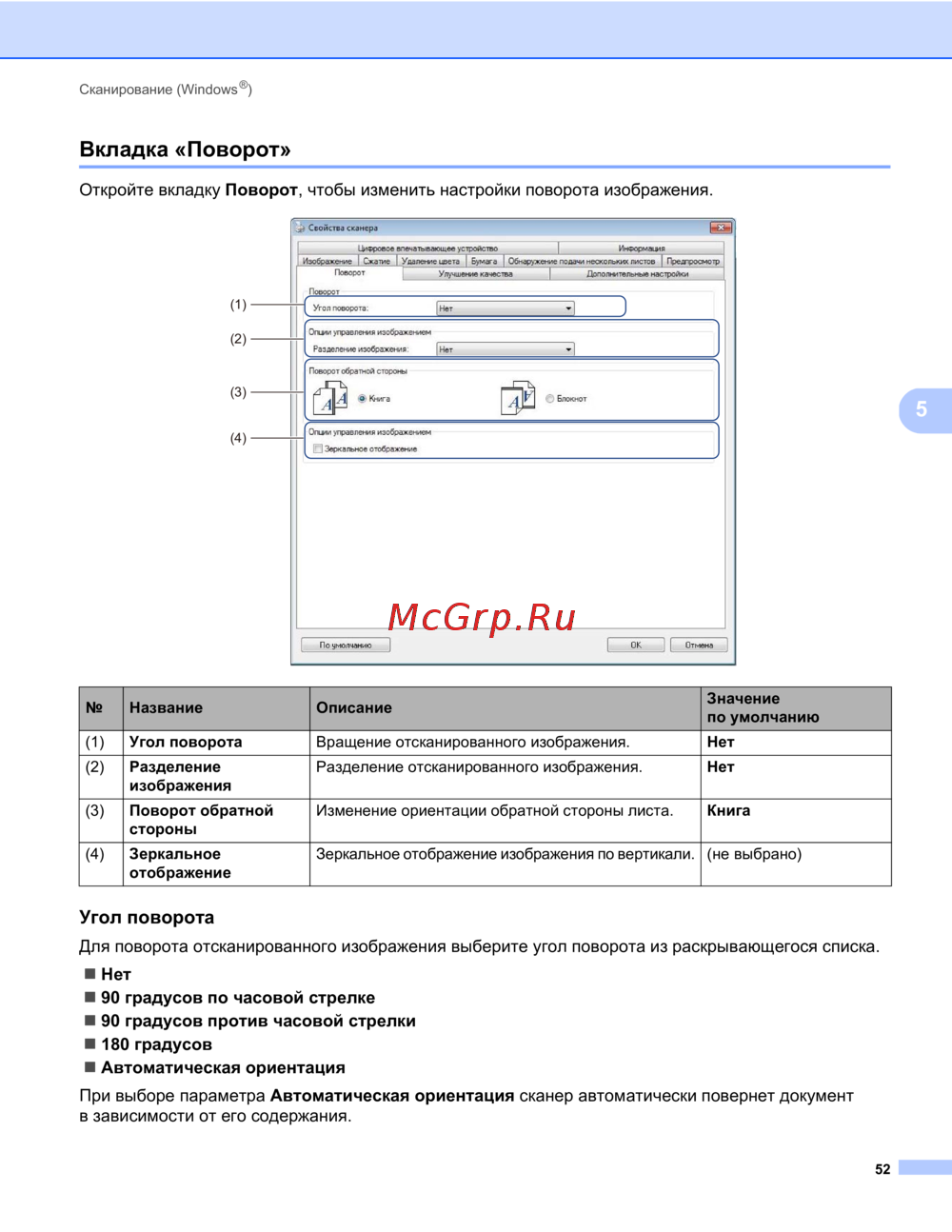 Измените угол поворота отсканированного изображения с помощью различных настроек. Узнайте, как автоматически ориентировать документы и использовать зеркальное отображение.