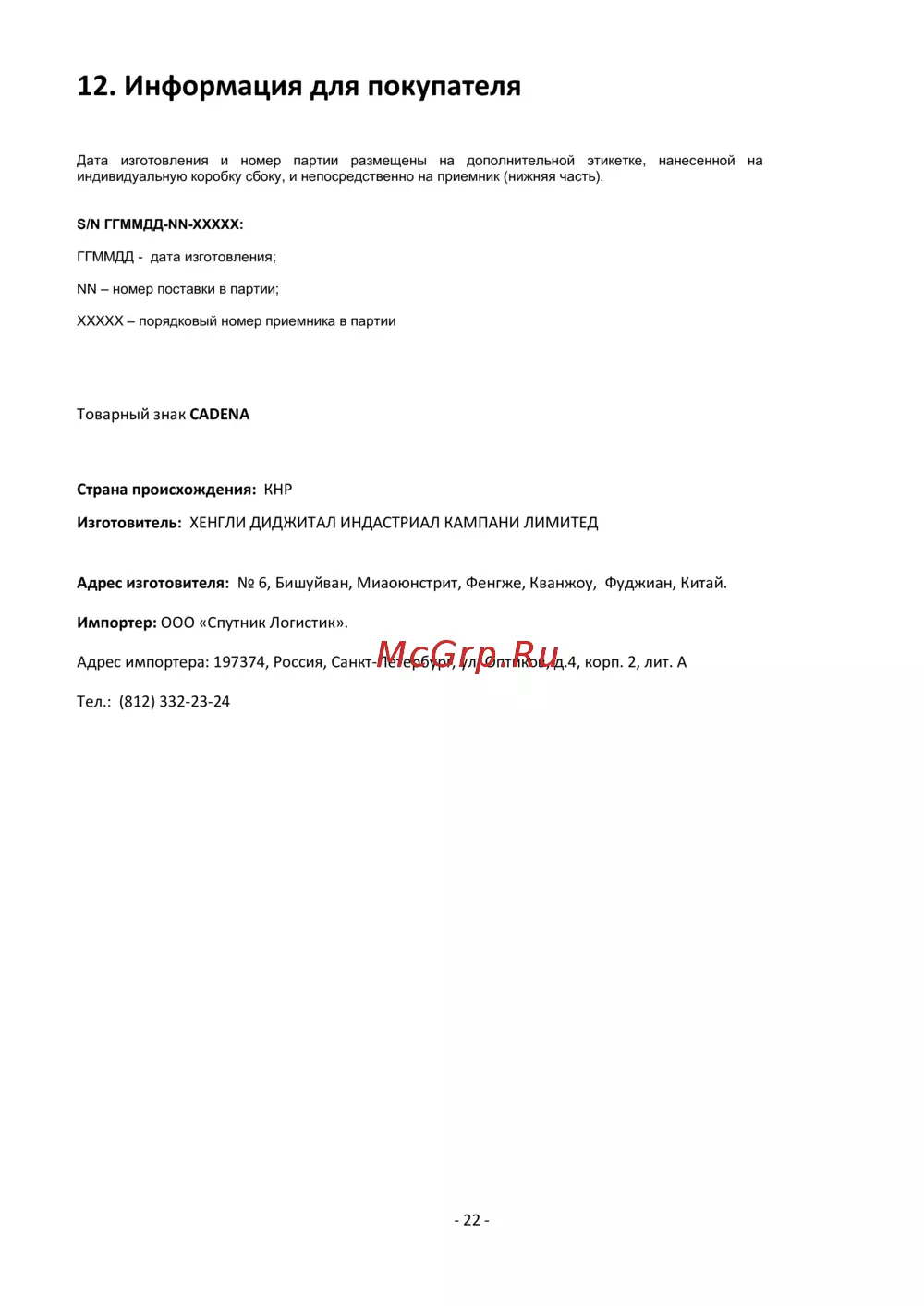 Cadena CDT-1711 SB [22/22] Информация для покупателя