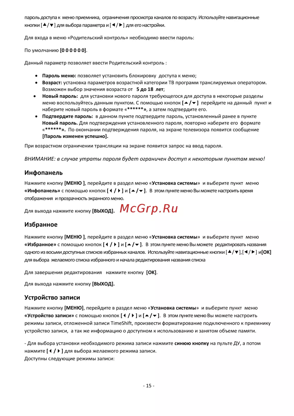 - Внимание в случае утраты пароля будет ограничен доступ к некоторым пунктам меню p.15