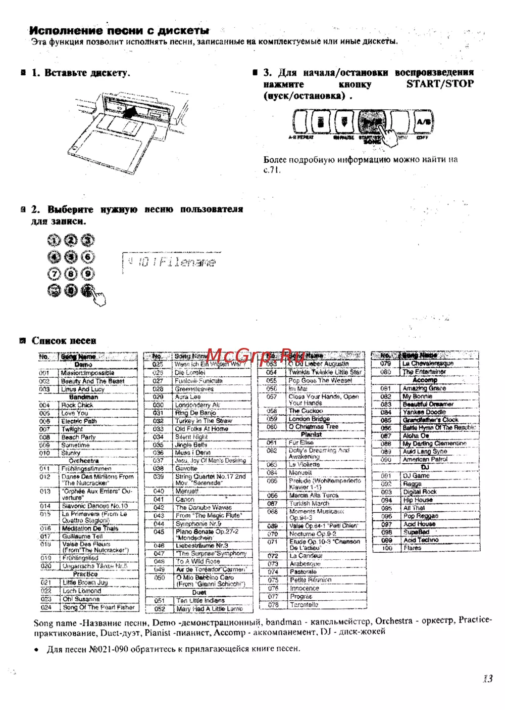 Исполнение песни с дискеты Эта функция позволит исполнять песни записанные на комплектуемые или иные дискеты 3 Для начала остановки воспроизведения нажмите кнопку START STOP нуск остановка в 1 Вставьте дискету Более подробную информацию можно найти на с П а 2 Выберите нужную песню пользователя для записи я Список песен iS I 025 Wenn Ich Ein Ян Missionrlmposstbte 002 Beaut And Hie Beast Linus And Lucy 003 Sandman Rode Chick 004 025 02 028 029 030 Die Lorelei ООО 006 007 Love You Electric Path TwHight 008 Beach Partv Sometime Siunky Orchestra Frühlingsetimrnen Pane Des Mirlitons From The Nutcraçkar 031 032 Û33 034 035 036 037 Demo J 009 010 04 012 013 014 0 15 016 017 01U 019 020 021 022 023 024 Orphée Aux Enfers Ou verture Siavenk Dances No 10 La Primavera From Le Quattro Slagioni Méditation De thaïs Guillaume Tei Valsé Des Fleuo From The Nutçracker FrOhlifiQsli d Jfiçjarischa Hr 5 Practice Little Brown Juy Loch Lbmond Oh Susanna Song Ol The Peari Fisher 038 039 040 041 042 043 044 045 046 047 048 Ü49 050 Funiculi Funtcufe 053 054 055 __ Greensleeves Aura Lea 057 Londonderry M Ring De Banjo Turkey In The Straw Old Folks At Home 058 059 060 Silent Night Jlnple Bells Muss iDenn Jesu Joy Di Man s Desiring Gwotte String Quartet No 17 2nd Mov Serenade Menuett Canon The Danube Waves From The Magic Flute Symphonie Nr Piano Sonata Op 27 2 Mondschein Liebeaîr ume Nr 3 The Surpn8e Symphony To A Wiki Rosa Аи de Toréador Caimetï 0 Mio öabbino Caro From Gianni Sohicchi Duet Ten Little Indians Û51 052 Maiy Had A Litte Lame 079 I La Çhwatewqtsque Au u n I War j Twinkle Twinkle Little Star Pc p Goes The Weasel Im Ma __ _______ _________ Close Your Hands Open Your Hanes The Cuckoo London Bridge O Christmas Tree Pianist 061 G62 _063_ Ж 065 Für Elise ____ _ __ _ DcJiy e Dreaming And Awakening_____ _ La Vioitetta ______ j Monu it ____ _ Prelude Wc ltemperlert KlavWi i 066 067 068 Marcia Alla Turca Turkish March Moments Musicaux 039 070 071 Valse 0p 64 1 Petti Chien1 Nocturne Op 9 2 Etude Op 10 3 Chanson De L adieu La Candeur______ ____ Arabesque Pastorale Petite Réunkin _ ___________ 072 073 ÜZ4 075 1 Алмта 081 082 083 084 065 066 Amazing Grace My Bonnie Beautiful Dreamer j J 067 088 089 Û9Ü Yankas Doodle Grandfather s Clock Battie Hymn ÖfThe Ftepubrr l Aloha Oe My Darting Clementine Auto Lang Syne American Patrol 091 DJ Game Û9 2 093 094 095 Ragge Digital Rock Hip House AH That Pop Reggae DJ 096 076 077 Innocence 078 Tarantella 097 098 099 ÎÛ0 Acid House FupeBad Acid Techno Flares Procjres Song name Название песни Demo демонстрационный bandman капельмейстер Orchestra оркестр Practiceпрактикование Duet дуэт Pianist пианист Äccomp аккомпанемент DJ диск жокей Для песен 021 090 обратитесь к прилагающейся книге песен ____ J I I j