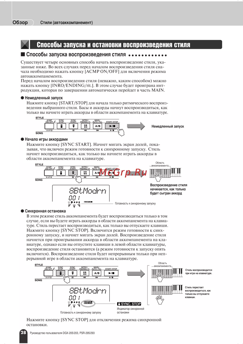 Обзор Стили автоаккомпанемент Способы запуска и остановки воспроизведения стиля Способы запуска воспроизведения стиля Существует четыре основных способа начать воспроизведение стиля ука занные ниже Во всех случаях перед началом воспроизведения стиля сна чала необходимо нажать кнопку АСМР ON OFF для включения режима автоаккомпанемента Перед началом воспроизведения стиля неважно каким способом можно нажать кнопку INRO ENDING rit В этом случае будет проиграна инт родукция которая по завершении автоматически перейдет в часть MAIN Немедленный запуск Нажмите кнопку 8ТАИТ 8ТОР для начала только ритмического воспроиз ведения выбранного стиля Басы и аккорды начнут воспроизводиться как только вы начнете играть аккорды в области аккомпанемента на клавиатуре STYLE Немедленный запуск Начало игры аккордами Нажмите кнопку SYNC START Начнет мигать экран долей зывая что включен режим готовности к синхронному запуску Стиль начнет воспроизводиться как только вы начнете играть аккорды в области аккомпанемента на клавиатуре пока Область STYLE ККП МП л НРМР НГА Воспроизведение стиля начинается как только будет сыгран аккорд Готовность к синхронному запуску Синхронная остановка В этом режиме стиль аккомпанемента будет воспроизводиться только в том случае если вы будете играть аккорды в области аккомпанемента на клавиа туре Стиль перестает воспроизводиться как только вы отпускаете клавиши Нажмите кнопку SYNC STOP Включится режим готовности к синх ронному запуску и начнет мигать экран долей Воспроизведение стиля начнется при проигрывании аккорда в области аккомпанемента на кла виатуре однако если вы отпустите клавиши в левой области клавиатуры воспроизведение стиля остановится а режим готовности к запуску опять включится Воспроизведение стиля будет непрерывным только при неп рерывной игре в области аккомпанемента на клавиатуре Стиль воспроизводится при игре на клавиатуре Стиль перестает воспроизводиться как только вы отпускаете клавиши Нажмите кнопку остановки SYNC STOP для Руководство пользователя DGX 205 203 PSR 295 293 отключения режима синхронной